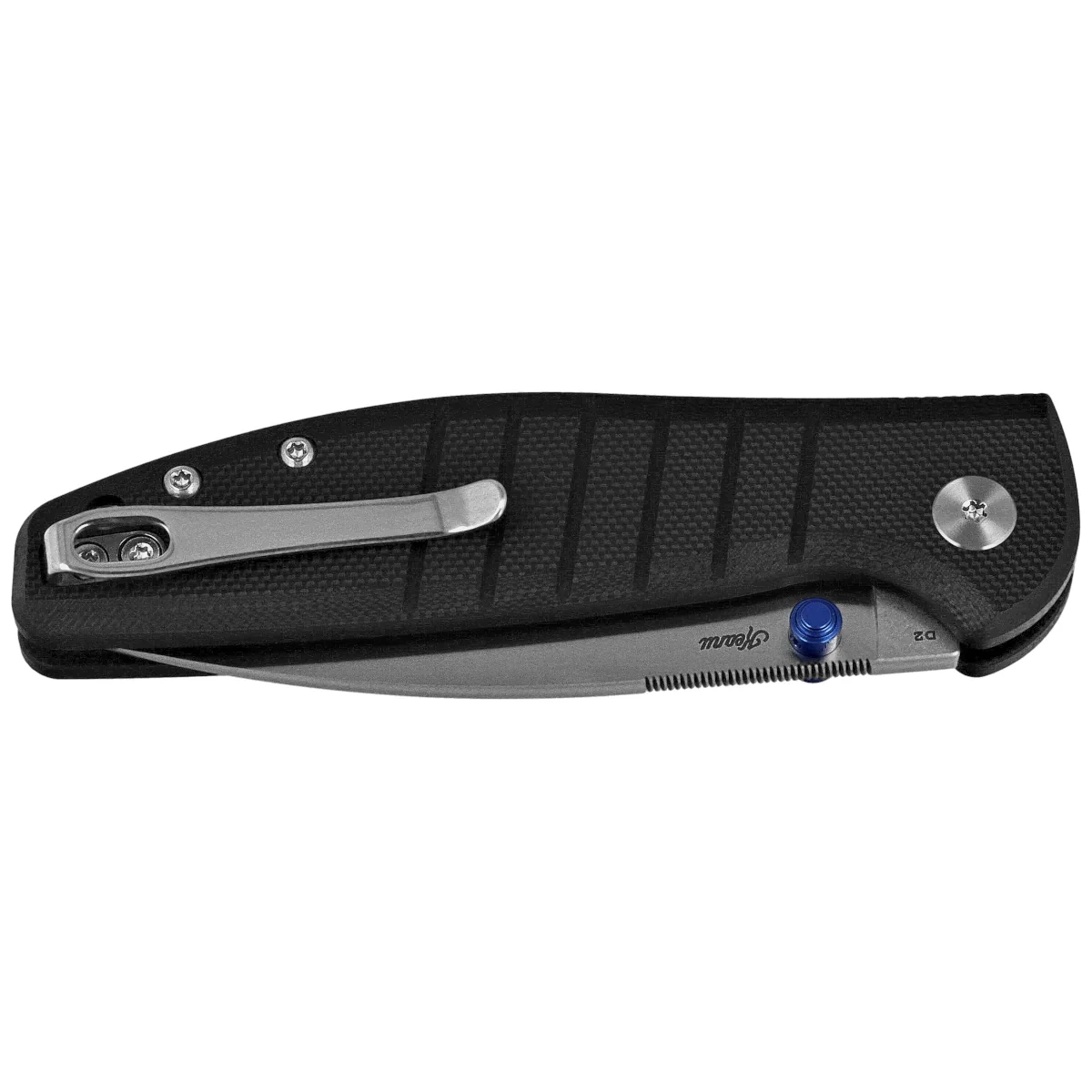 Głownia - typu Drop Point o długiej krawędzi tnącej, z efektownym wykończeniem Two Tone, szlif satynowany, pozostała część wykończona metodą Stonewashed. Niewielka grubość klingi w połączeniu z wysokim, płaskim szlifem daje doskonałą geometrię krawędzi tnącej oraz ekstremalną wydajność cięcia. Ceramiczne łożyska kulkowe wspomagają płynną pracę mechanizmu otwierającego klingę, którą można otworzyć za pomocą obustronnego kołka w klindze (dual thumb stud). Kołek został anodyzowany na niebiesko co daje ładny kontrast z kolorem klingi. Na grzbiecie klingi upper jimping, karbowane oparcie pod kciuk. Całość blokowana jest solidną blokadą button lock.