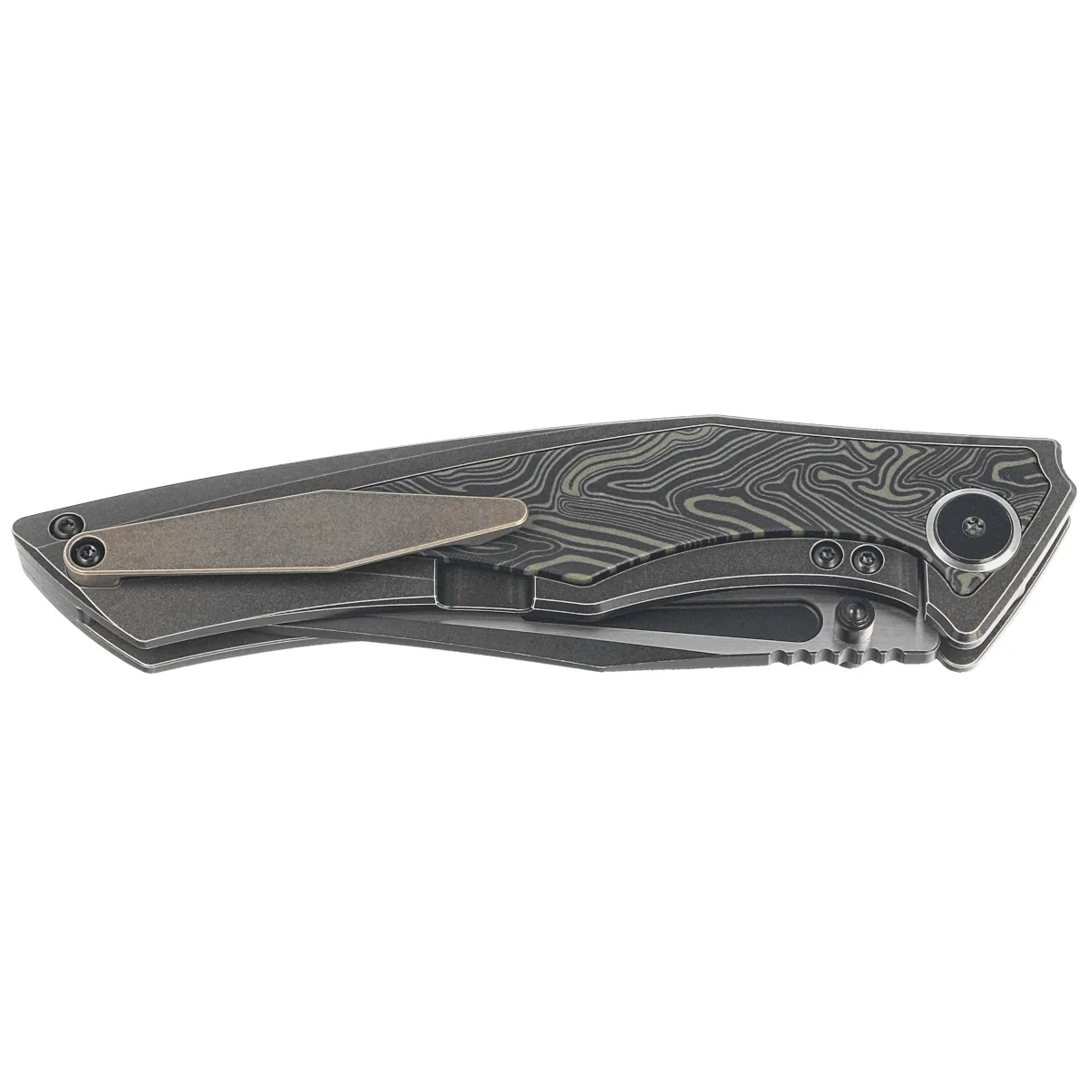 Rękojeść - z litego tytanu 6AL4V z idealnie wkomponowaną wkładką z dwukolorowego kompozytu G10. Fazowane krawędzie okładek eliminują ostre ranty dla wygody i poprawiają pewność uchwytu. Masywny tytanowy backspacer do którego przymocowano okładziny gwarantuje sztywność i wytrzymałość całej konstrukcji. Jednopozycyjny, prawostronny tytanowy klips umożliwia przenoszenie noża w pozycji tip-up, czubkiem ostrza ku górze.