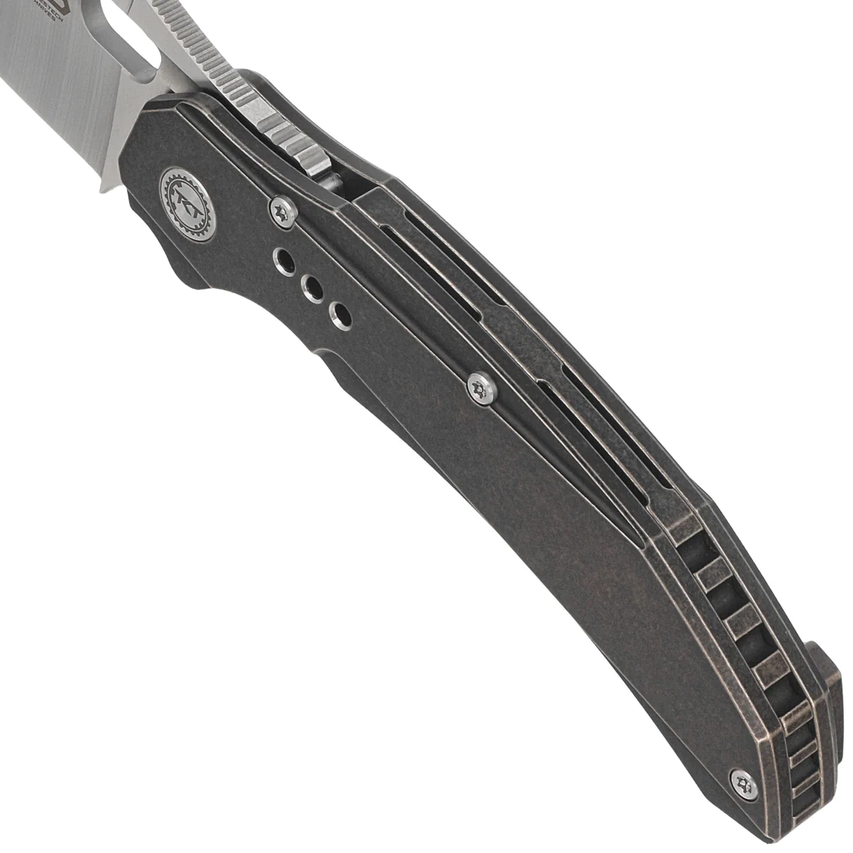 Rękojeść - to dwa kawałki litego tytanu 6AL4V. Fazowane krawędzie okładek eliminują ostre ranty dla wygody i poprawiają pewność uchwytu. Masywny tytanowy backspacer do którego przymocowano okładziny gwarantuje sztywność i wytrzymałość całej konstrukcji. Oś piwota ozdobiona logiem projektantów, Todd Knife and Tool. Jednopozycyjny, prawostronny tytanowy klips umożliwia przenoszenie noża w pozycji tip-up, czubkiem ostrza ku górze.