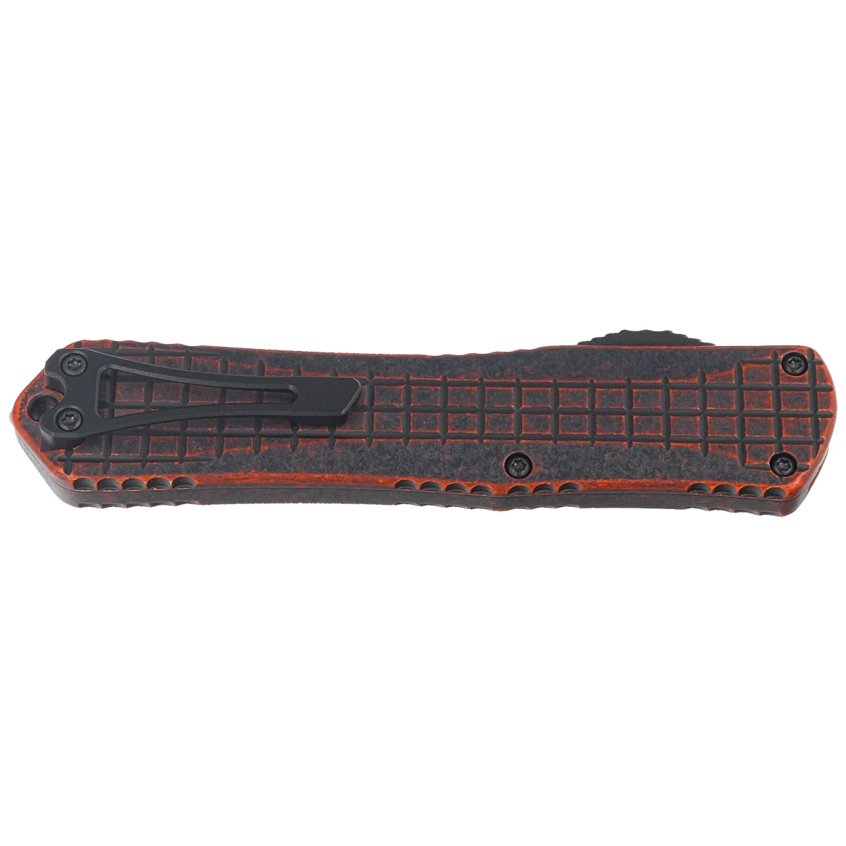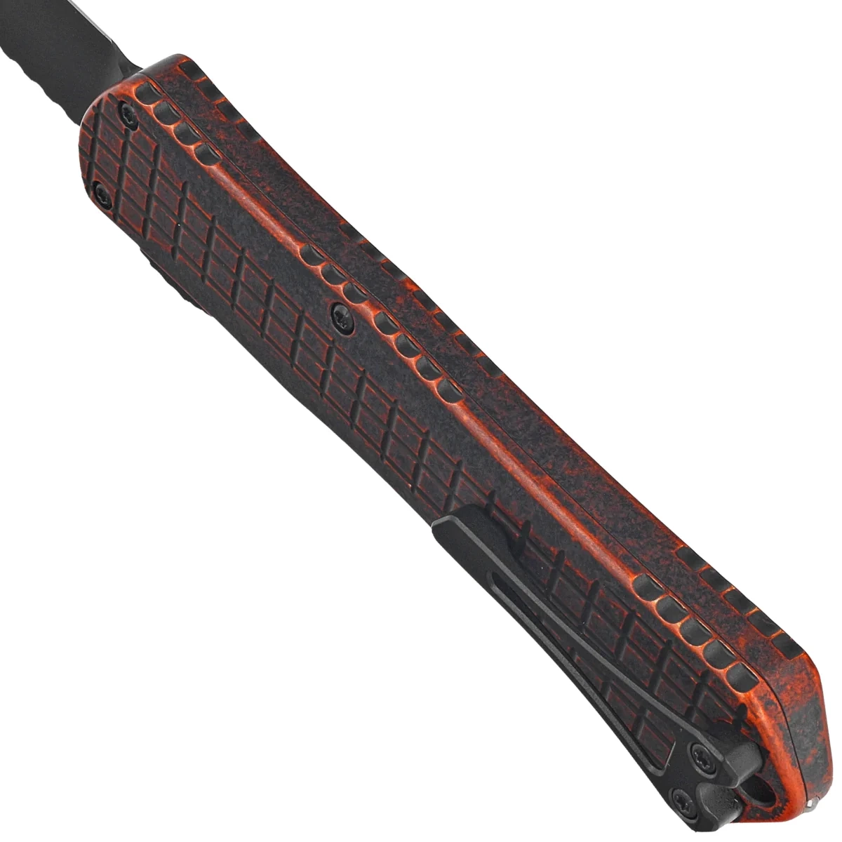 Rękojeść - wykonana z doskonałą precyzją w technologii 3D na frezarkach CNC, z anodyzowanego aluminium 6061-T6. Grenade Grip charakterystyczna faktura rękojeści imitująca powierzchnie granatu odłamkowego (Frag Pattern) oprócz walorów wizualnych powoduje, że nóż nie ślizga się w dłoni podczas używania. Powierzchnia z efektownym wykończeniem Breakthrough, przecierany czarny wierzch, spod którego prześwituje pomarańcz. Na grzbiecie i dole rękojeści znajdują się nacięcia (jimping) dla pewniejszego chwytu. Smukły profil oraz frezowany dwupozycyjny (prawa/lewa) masywny klips typu deep carry, umożliwiają dyskretne przenoszenie noża w każdej kieszeni w pozycji tip-down (czubkiem ostrza do dołu). Rękojeść zakończono lanyard hole, otworem na linkę i zbijakiem do bicia szyb.