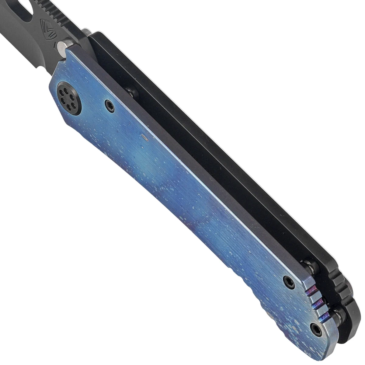 Rękojeść - z litego tytanu, po stronie prezentacyjnej została wykończona niebieskim wzorem "Galaxy". Strona blokady pokryta czarną powłoką. Otwarta konstrukcja tzw. open-backed bez typowego backspacera, mocowana do siebie tulejami dystansowymi ułatwia czyszczenie. Prosta i niezawodna konstrukcja. Całości dopełnia masywny klips, oczywiście również z tytanu, wykończony niebieskim wzorem "Galaxy".
