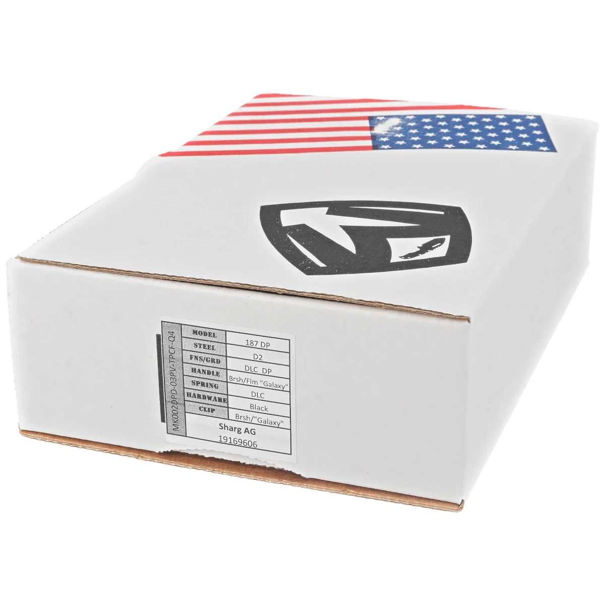 187 DP Brushed/Flamed "Galaxy" Titanium, Black HW, Brsh/"Galaxy" Clip, Black DLC potężnie zbudowany nóż składany, idealny dla osób o dużych dłoniach, nadający się do niemal każdego zadania, w którym niezbędne jest użycie nóż. Otwierany za pomocą owalnego otworu w klindze. Szlif wklęsły na ostrzu ze stali D2 został wykonany ręcznie. Jest to rzadkość w branży nożowej; tylko kilku producentów jest w stanie wykonać ręcznie szlif wklęsły. Po otwarciu solidna blokada framelock utrzymuje ostrze na miejscu. Stop-pin został wciśnięty w ostrze tak, że opiera się symetrycznie o rękojeść, co znakomicie zwiększa wytrzymałość. Nazwa noża pochodzi od grubości (0.187") okładzin z tytanu użytego do budowy rękojeści. Wytworzony w całości w USA, zgodnie z wysokimi standardami marki Medford.