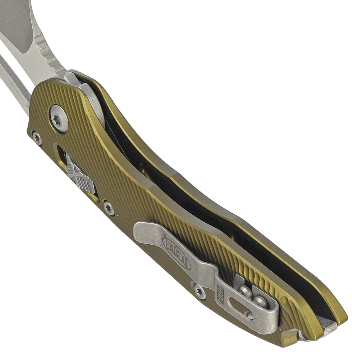 Rękojeść - wykonana na frezarkach CNC z doskonałą precyzją, z kompozytu G10, praktycznie niezniszczalnego tworzywa niewrażliwego na warunki atmosferyczne, odpornego na chemikalia i uszkodzenia mechaniczne, o głęboko frezowanej strukturze 3D Fluted. Szeroki suwak blokady z charakterystyczną dla firmy Microtech schodkową strukturą X. Obie okładziny zostały skręcone przy pomocy solidnego, aluminiowego backspacera. Dwustronny (prawa / lewa) klips pozwala dyskretnie nosić nóż w pozycji tip-up. Wystający fragment backspacera w którym znajduje się otwór na linkę, może również służyć za improwizowany zbijak do szkła.