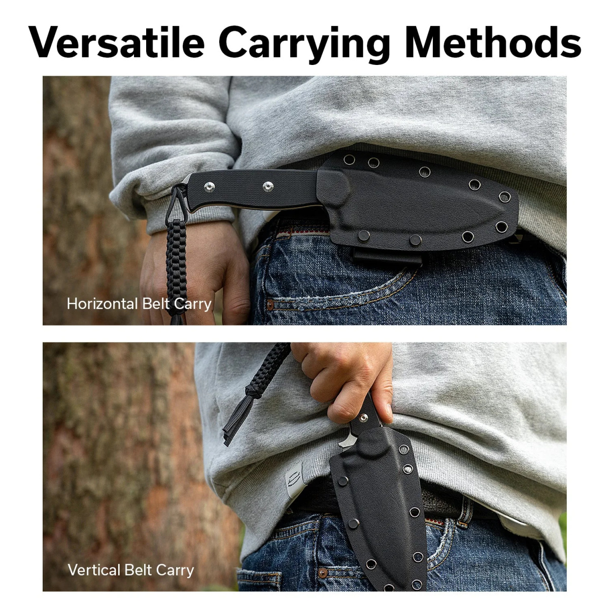 Pochwa - wykonana z czarnego kydexu bezpiecznie utrzymująca nóż na miejscu. Wyposażona w mocowanie T-Clip zaprojektowane przez Boba Terzuolę, umożliwia wielopozycyjne (prawe/lewe, pionowe/poziome) przenoszenie pochwy z stałym ostrzem na pasie lub oporządzeniu. T-Clip działający podobnie jak Tek-Lok pozwala na dopasowanie sposobu noszenia do indywidualnych preferencji użytkownika. Wzmocniony włóknem szklanym T-Clip, zawiera zestaw śrub wraz z parą plastikowych podkładek.