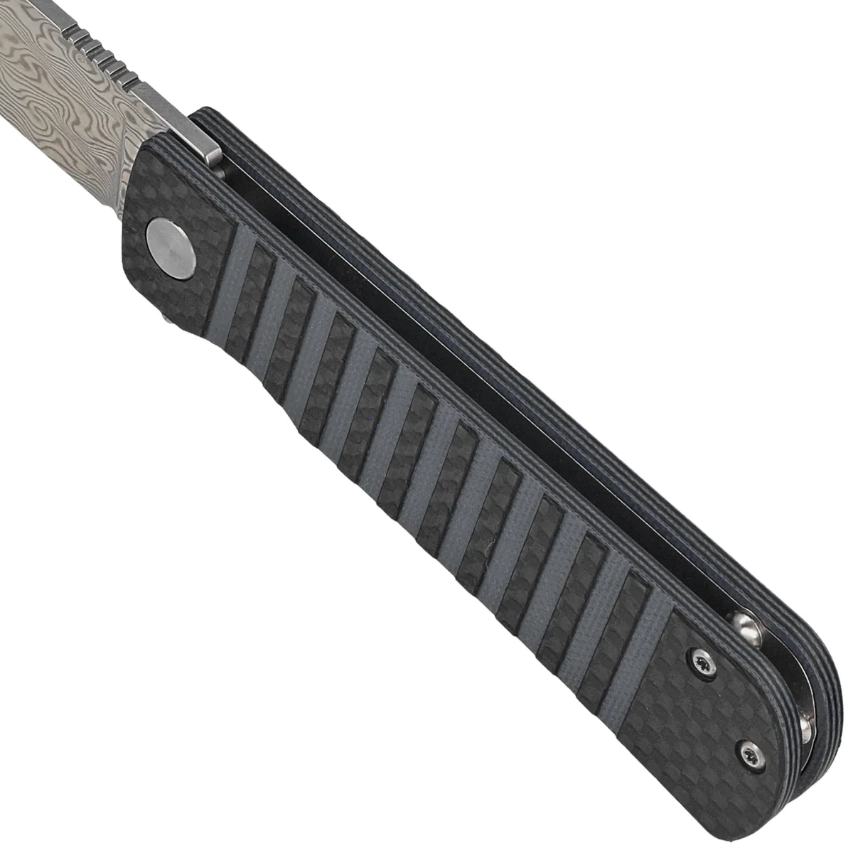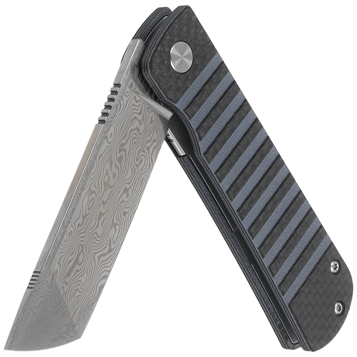 • Titan Black Carbon Fiber/Blue G10, Damascus, kompaktowy folder EDC, efekt współpracy projektanta Keanu Alfaro z firmą Bestech. Szeroka, uniwersalna klinga doskonale sprawdzi się przy cięciu czy krojeniu. Wygodna, ergonomiczna rękojeść, doskonały wybór!