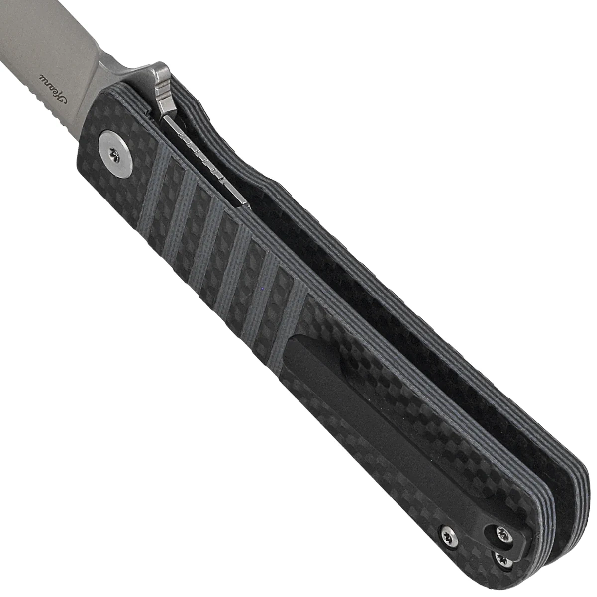 Rękojeść - okładziny z kompozytu G10 laminowanego na powierzchni warstwą Carbon Fiber, tworzywa niewrażliwego na warunki atmosferyczne, odpornego na chemikalia i uszkodzenia mechaniczne. Fazowane krawędzie okładek eliminują ostre ranty a charakterystyczne pionowe wyżłobienia powierzchni poprawiają pewność uchwytu. Otwarta konstrukcja tzw. open-backed mocowana stalowymi tulejami dystansowymi redukuję wagę oraz ułatwia czyszczenie. Jednopozycyjny (prawa) klips umożliwia przenoszenie noża w pozycji tip-up, czubkiem ostrza ku górze. Nad klipsem otwór do przewleczenia linki zabezpieczającej lub ozdobnej.