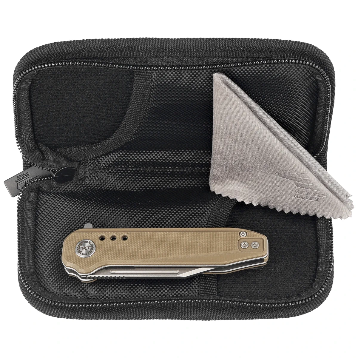 Rękojeść - okładziny z kompozytu G10, tworzywa niewrażliwego na warunki atmosferyczne, odpornego na chemikalia i uszkodzenia mechaniczne Fazowane krawędzie okładek eliminują ostre ranty a teksturowanie powierzchni poprawia pewność uchwytu. Backspacer do którego przymocowano okładziny gwarantuje sztywność i wytrzymałość całej konstrukcji. Oś pivota ozdobiona logiem projektantów, Todd Knife and Tool. Dwupozycyjny (prawa/lewa) klips umożliwia przenoszenie noża w pozycji tip-up, czubkiem ostrza ku górze.