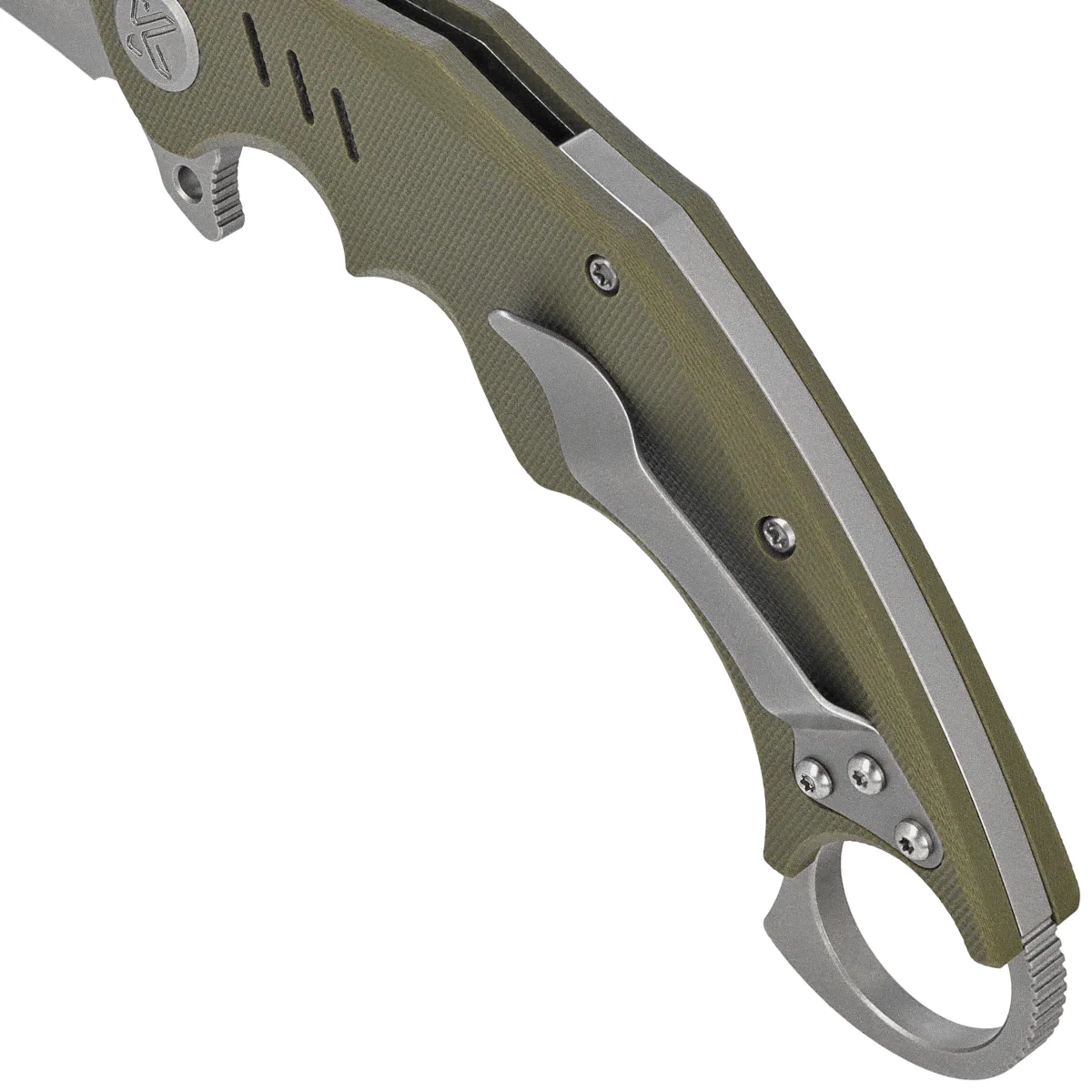 • Wrath Green G10, Beadblasted kompaktowy karambit projektu MUZI Design. Zakrzywiona głownia ze stali Sandvik 14C26N, profilowana rękojeść z kompozytu G10. Trzy sposoby otwierania, flipper, otwór na kciuk oraz szybkiego otwarcia o krawędź kieszeni.