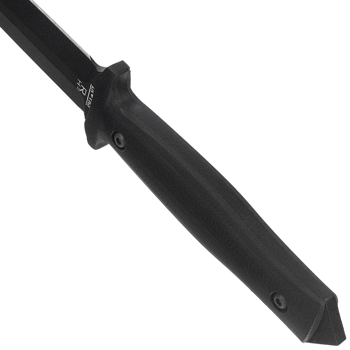 Głownia - szeroka, o profilu Daggerz obusieczną krawędzią tnącą. Pokryta czarną powłoką ochronną głownia, wyprowadzona wysokim szlifem płaskim (Flat Grind), który daje doskonałą geometrię krawędzi tnącej oraz ekstremalną wydajność cięcia. Obustronna garda chroni dłoń przed zsunięciem się na klingę.