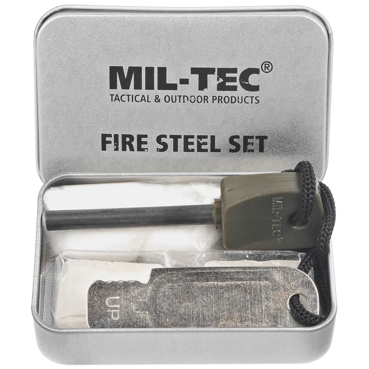 - Zestaw do rozpalania ognia Mil-Tec – niezawodny w survivalu i biwakach. Krzesiwo 3000°C, bawełna jako rozpałka i paliwo stałe w metalowym pojemniku. Kompaktowy i odporny na wilgoć!