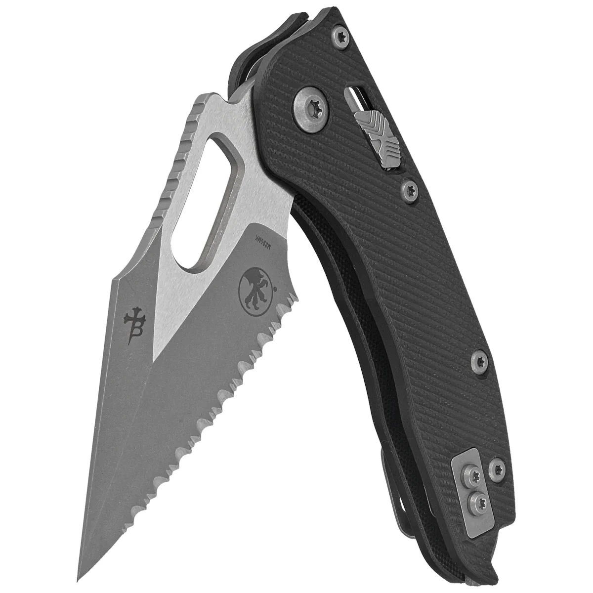 Rękojeść - wykonana na frezarkach CNC z doskonałą precyzją, z kompozytu G10, praktycznie niezniszczalnego tworzywa niewrażliwego na warunki atmosferyczne, odpornego na chemikalia i uszkodzenia mechaniczne, o głęboko frezowanej strukturze 3D Fluted. Szeroki suwak blokady z charakterystyczną dla firmy Microtech schodkową strukturą X. Obie okładziny zostały skręcone przy pomocy solidnego, aluminiowego backspacera. Dwustronny (prawa / lewa) klips pozwala dyskretnie nosić nóż w pozycji tip-up. Wystający fragment backspacera w którym znajduje się otwór na linkę, może również służyć za improwizowany zbijak do szkła.