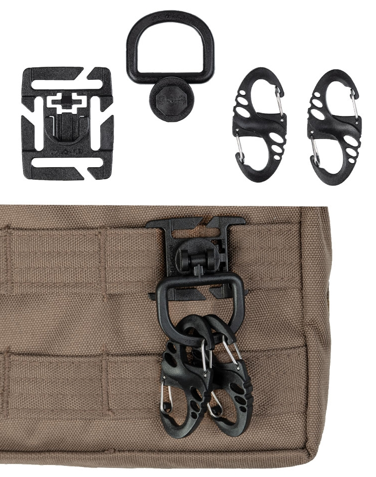Uniwersalne zastosowanie – zestaw umożliwia łatwe troczenie drobnego ekwipunku i akcesoriów, takich jak klucze, breloki, rękawiczki czy latarki, zwiększając funkcjonalność oporządzenia taktycznego.