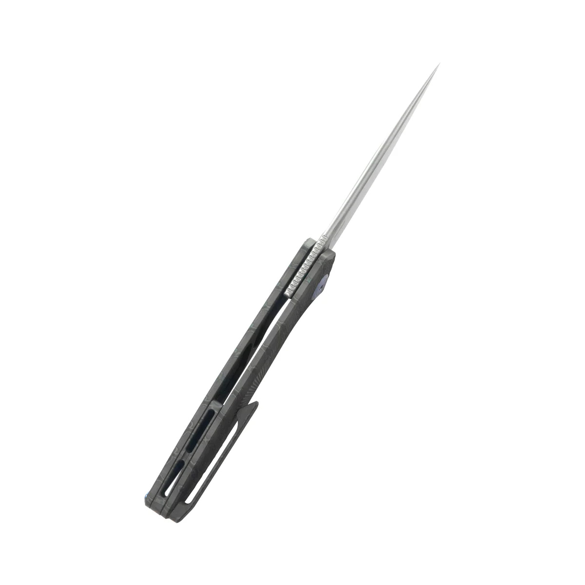Rękojeść - profilowane okładziny z litego tytanu 6AL4V barwione płomieniowo wzorem Tiger Stripes, teksturowane dla poprawienia pewności uchwytu. Całość skręcona do solidnego backspacera, również wykonanego z tytanu. Prosta, solidna konstrukcja daje pewność wieloletniego użytkowania. Głębokie podcięcie na palec (fore finger groove) poprawia pewność uchwytu. Jednopozycyjny (prawa) tytanowy klips deep carry pozwala przenosić dyskretnie nóż w kieszeni w pozycji tip-up (czubkiem ostrza do góry).