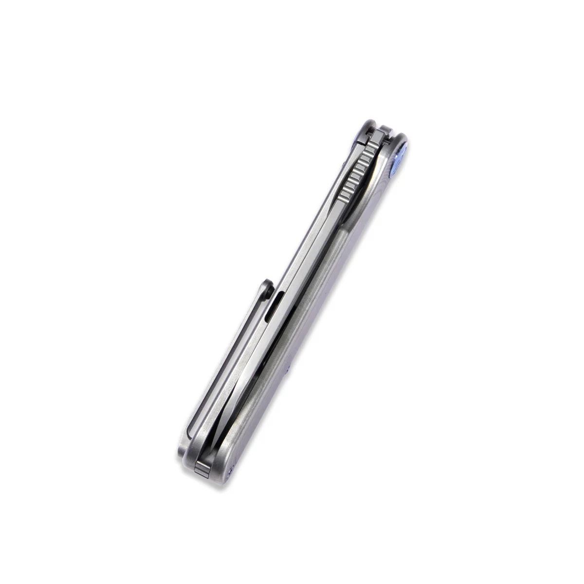 Rękojeść - profilowane okładziny z tytanu 6AL4V. Całość skręcona do solidnego backspacera, również wykonanego z tytanu. Prosta, solidna konstrukcja daje pewność wieloletniego użytkowania. Oś pivota zdobi nakładka z tytanu (Pivot Cap) w kontrastowym kolorze. Jednopozycyjny (prawa) tytanowy klips deep carry pozwala przenosić dyskretnie nóż w kieszeni w pozycji tip-up (czubkiem ostrza do góry). W tylnej części backspacera ukryte miejsce do przewleczenia linki zabezpieczającej lub ozdobnej.