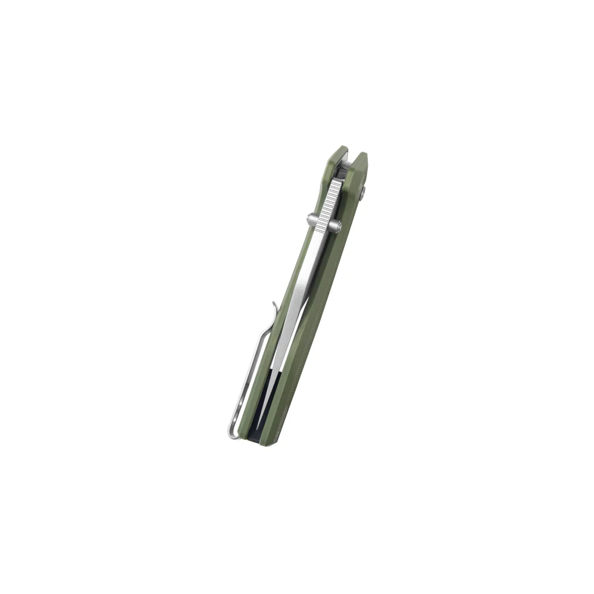 Rękojeść - okładziny z kompozytu G10, materiału niezwykle wytrzymałego mechanicznie i praktycznie całkowicie odpornego na warunki atmosferyczne i działanie chemikaliów, teksturowane dla poprawienia pewności uchwytu, przykręcono do stalowej ramy noża. Masywny backspacer zapewnia pożądaną sztywność. Prosta, solidna konstrukcja daje pewność wieloletniego użytkowania. Oś pivota zdobi stylizowane logo producenta. Dwupozycyjny (prawa/lewa) metalowy klips deep carry pozwala przenosić dyskretnie nóż w kieszeni w pozycji tip-up (czubkiem ostrza do góry). W zagłębieniu backspacera miejsce na zamocowanie linki zabezpieczającej lub ozdobnej.
