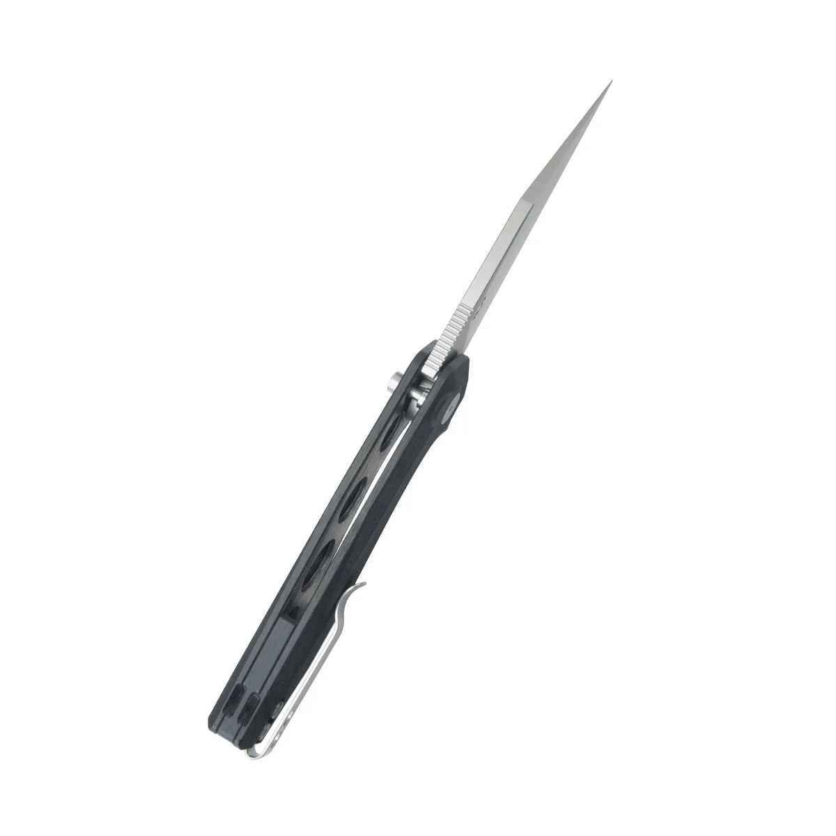 Rękojeść - okładziny z kompozytu G10, materiału niezwykle wytrzymałego mechanicznie i praktycznie całkowicie odpornego na warunki atmosferyczne i działanie chemikaliów, teksturowane dla poprawienia pewności uchwytu, przykręcono do stalowej ramy noża. Masywny backspacer zapewnia pożądaną sztywność. Prosta, solidna konstrukcja daje pewność wieloletniego użytkowania. Oś pivota zdobi stylizowane logo producenta. Dwupozycyjny (prawa/lewa) metalowy klips deep carry pozwala przenosić dyskretnie nóż w kieszeni w pozycji tip-up (czubkiem ostrza do góry). W zagłębieniu backspacera miejsce na zamocowanie linki zabezpieczającej lub ozdobnej.