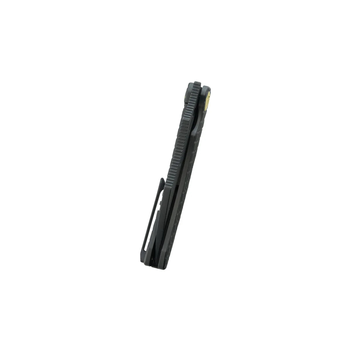 Głownia - szerokie, typu Wharncliffe, wykończona maskującą drobne rysy powstałe podczas użytkowania metodą Stonewashed, a następnie pokryta czarną powłoką. Prosta krawędź tnąca zbiega się w kierunku czubka klingi. Grubość klingi w połączeniu z płaskim szlifem daje doskonałą geometrię krawędzi tnącej oraz ekstremalną wydajność cięcia. Ceramiczne łożyska kulkowe odpowiadają za płynną i gładką pracę mechanizmu i wspomagają otwarcie ostrza za pomocą otworu w klindze. Na grzbiecie klingi upper jimping, karbowane oparcie pod kciuk. Mechanizm blokady to wytrzymały Frame Lock ze stalową wkładką zapobiegającą wycieraniu się czoła blokady.