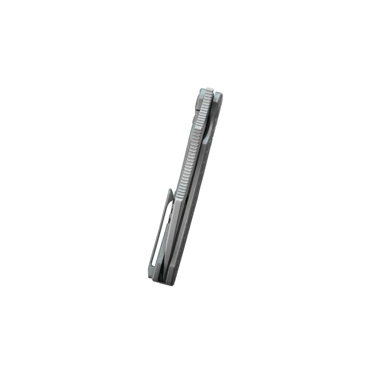 Rękojeść - z frezowanego tytanu 6AL4V, fazowane krawędzie okładek eliminują ostre krawędzie. Charakterystyczna faktura rękojeści imitująca powierzchnie granatu odłamkowego (Frag Pattern) oprócz walorów wizualnych powoduje, że nóż nie ślizga się w dłoni podczas używania. Całość przykręcona do solidnego backspacera, również wykonanego z tytanu. Oś pivota nakładka z tytanu (Pivot Cap) w kontrastowym kolorze. Podcięcie na palec (fore finger groove) poprawia pewność uchwytu. Jednopozycyjny (prawa) tytanowy klips deep carry pozwala przenosić dyskretnie nóż w kieszeni w pozycji tip-up (czubkiem ostrza do góry).