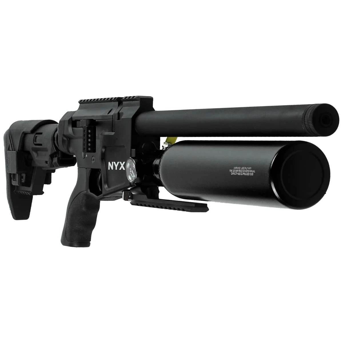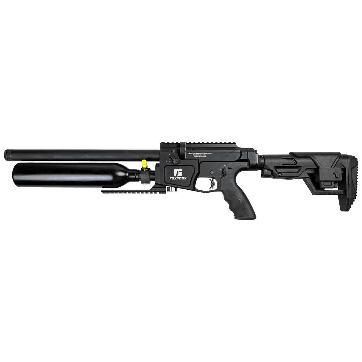 - Reximex NYX Compact 5.5 mm - kompaktowy, taktyczny karabin PCP, z dźwignią przeładowania Side Lever, regulatorem strzału, w pełni regulowaną teleskopową kolbą w systemie AR oraz zintegrowanym tłumikiem. Dostępny w kalibrach: 4.5 mm, 5.5 mm, 6.35 mm