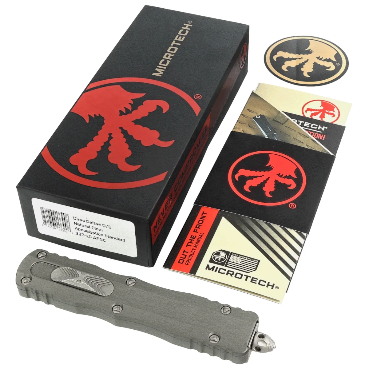 - Dirac Delta D/E Natural Clear Aluminium, Apocalyptic większa wersja noża automatycznego OTF z serii Dirac. Pracujący w trybie D/A, wyposażony w szybki mechanizm wysuwający ostrze. Przycisk slidera na boku rękojeści. Projekt Tony Marfione, Microtech Knives