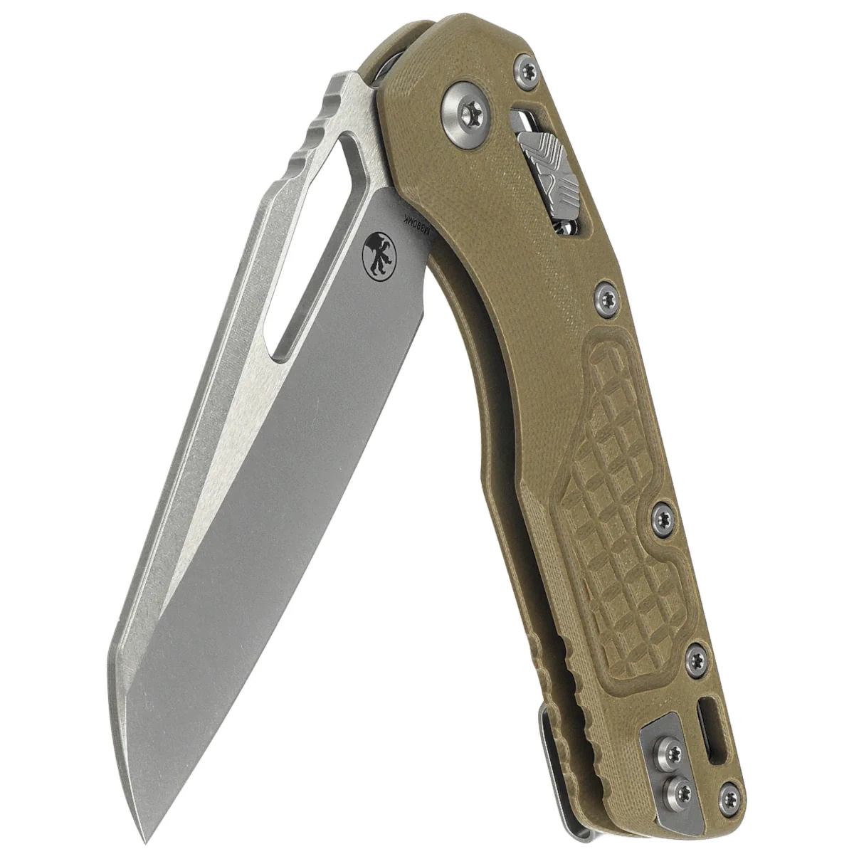 Rękojeść - wykonana z wytrzymałego kompozytu G10, charakterystyczna faktura rękojeści imitująca powierzchnie granatu odłamkowego (Frag Pattern) oprócz walorów wizualnych powoduje, że nóż nie ślizga się w dłoni podczas używania. Szeroki suwak blokady z charakterystyczną dla firmy Microtech schodkową strukturą X. Obie okładziny zostały skręcone przy pomocy solidnego, tytanowego backspacera. Dwustronny (prawa / lewa) klips pozwala dyskretnie nosić nóż w pozycji tip-up. Nad klipsem lanyard hole, miejsce na linkę zabezpieczającą lub ozdobną.