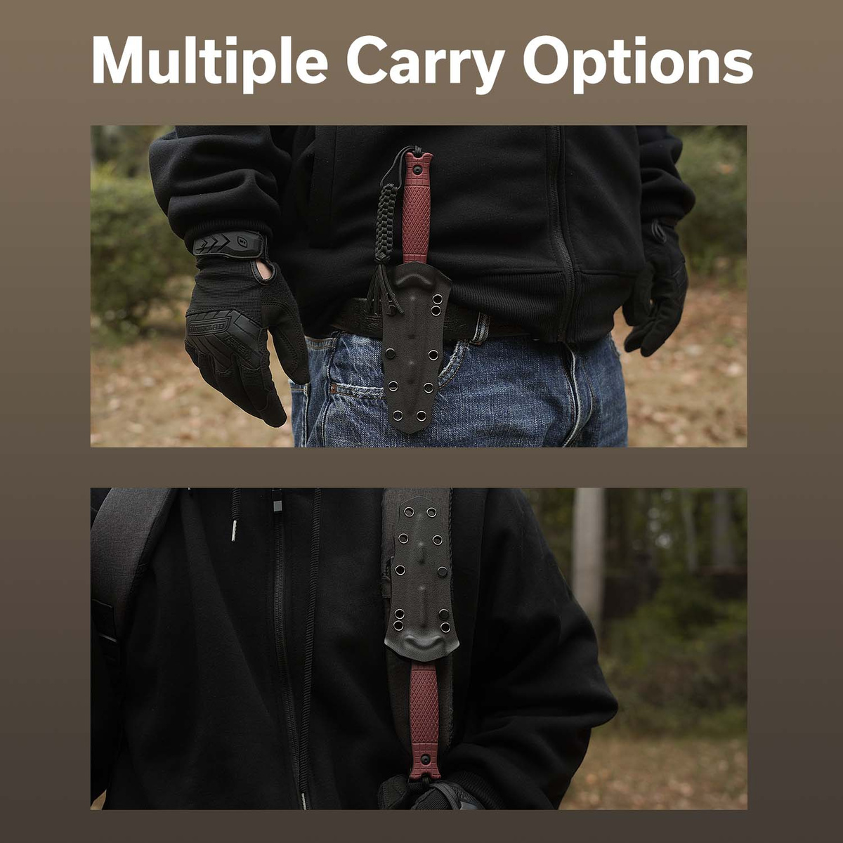 Pochwa - wykonana z czarnego kydexu bezpiecznie utrzymująca nóż na miejscu. Wyposażona w mocowanie T-Clip zaprojektowane przez Boba Terzuolę, umożliwia wielopozycyjne (prawe/lewe, pionowe/poziome) przenoszenie pochwy z stałym ostrzem na pasie lub oporządzeniu. T-Clip działający podobnie jak Tek-Lok pozwala na dopasowanie sposobu noszenia do indywidualnych preferencji użytkownika. Wzmocniony włóknem szklanym T-Clip, zawiera zestaw śrub wraz z parą plastikowych podkładek.