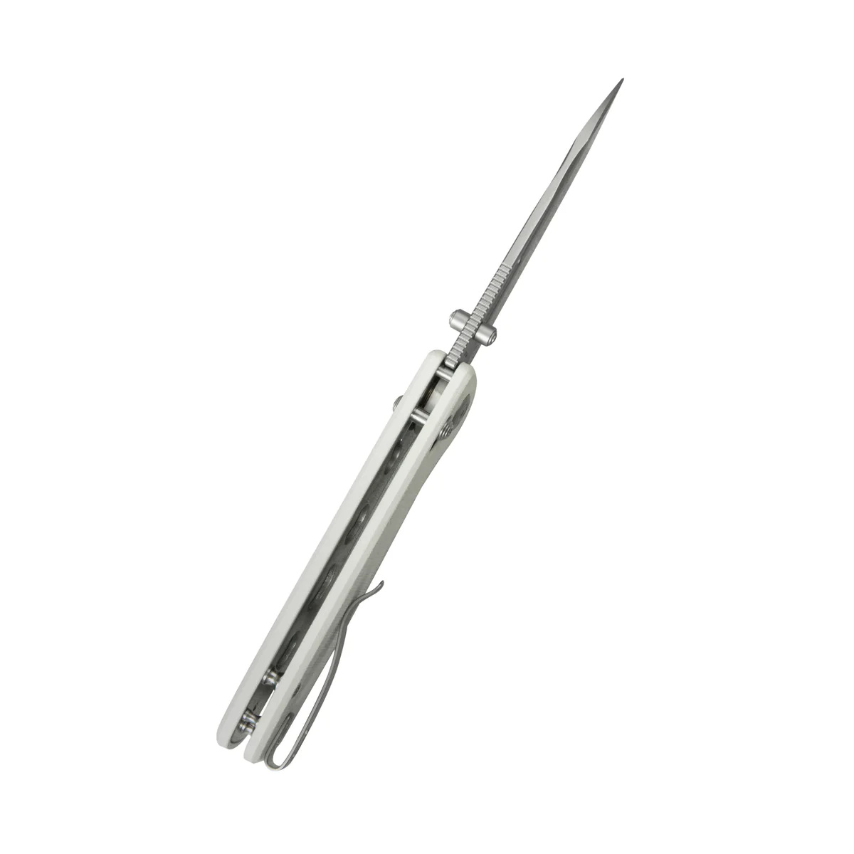 Rękojeść - okładziny z białego kompozytu G10, tworzywa niezwykle wytrzymałego, praktycznie niewrażliwego na warunki atmosferyczne i czynniki chemiczne. Teksturowane dla poprawienia pewności uchwytu, przykręcono do stalowej ramy noża. Otwarta konstrukcja tzw. open-backed bez typowego backspacera, mocowana do siebie stalowymi tulejami dystansowymi ułatwia czyszczenie. Prosta, solidna konstrukcja daje pewność wieloletniego użytkowania. Ergonomiczne zagłębienie pod palce ułatwiające chwyt rękojeści. Pivot ozdobiony stylizowanym logo producenta. Dwupozycyjny (prawa/lewa) stalowy klips deep carry pozwala przenosić dyskretnie nóż w kieszeni w pozycji tip-up (czubkiem ostrza do góry).