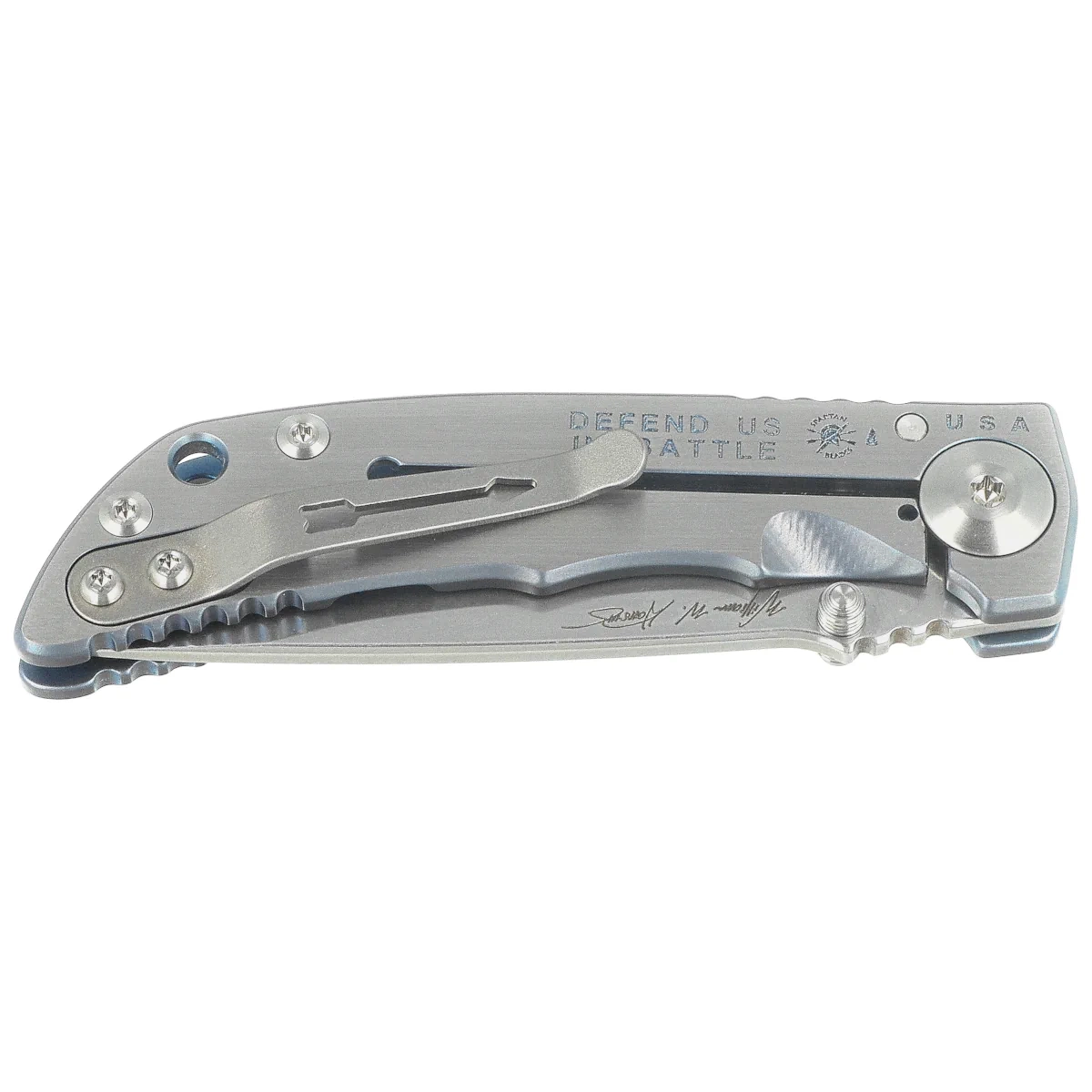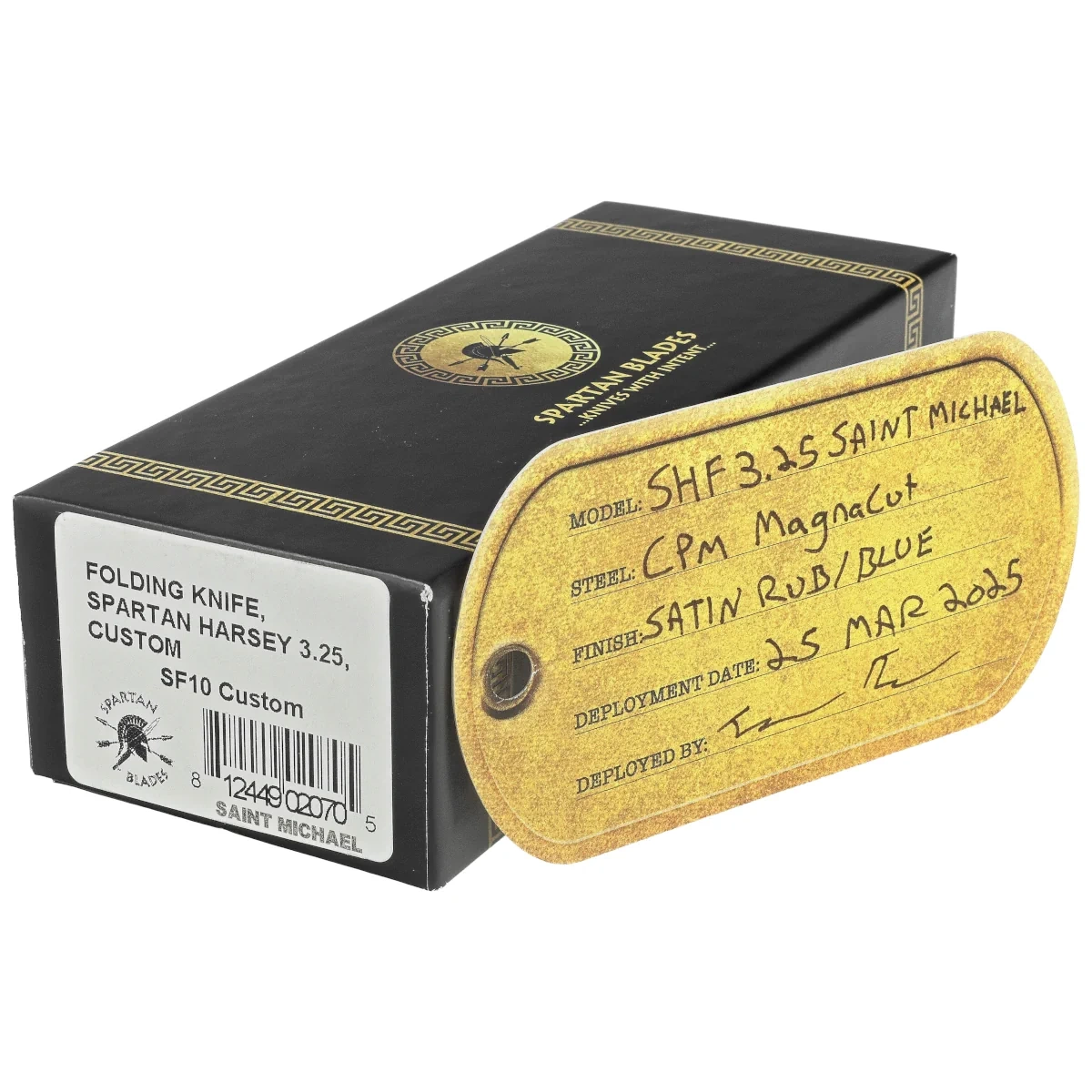 Spartan Harsey Folder 3.25 Special Edition "Saint Michael'' Satin Rub/Blue Titanium, Gray HW, Stonewashed. "Spartan Harsey Folder 3.25 St. Michael" lub "SHF 3.25 St. Michael" to limitowana edycja noża składanego, stworzonego według autorskiego projektu słynnego mistrza nożownictwa - Billa Harseya. Zdobywcy nagrody American Made Knife of The Year 2016 na targach nożowych Blade Show w Atlancie.