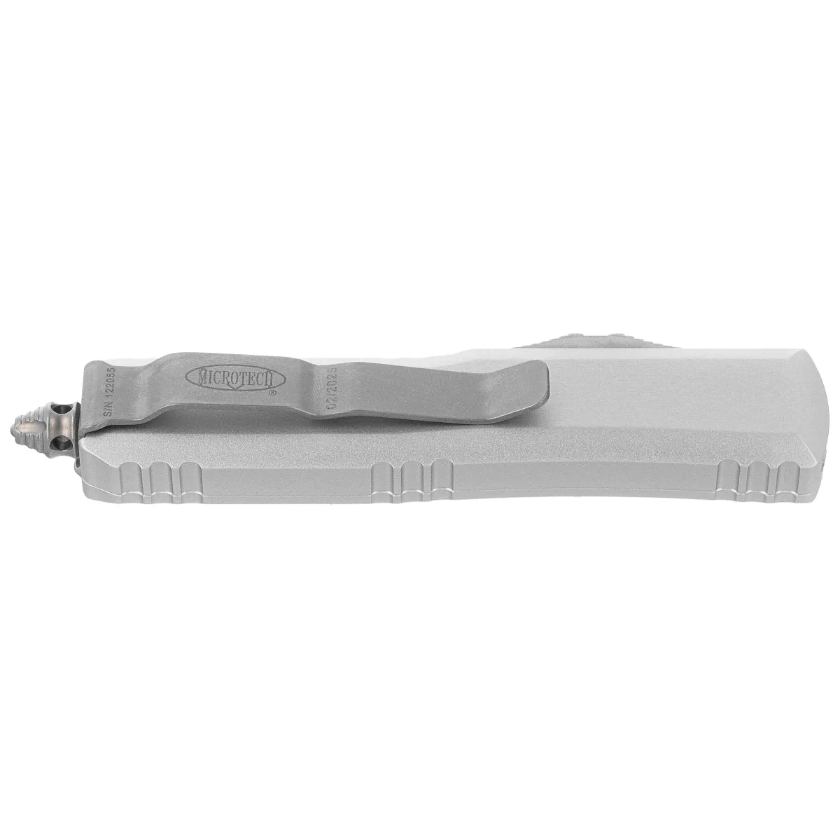 Rękojeść - wykonana z doskonałą precyzją w technologii 3D na frezarkach CNC, ze szczotkowanego i polerowanego aluminium 6061-T6.. Faktura powierzchni rękojeści powoduje, że nóż nie ślizga się w dłoni podczas używania. Na grzbiecie i dole rękojeści znajdują się nacięcia (jimping) dla pewniejszego chwytu. Smukły profil oraz frezowany dwupozycyjny (prawa/lewa) masywny klips typu deep carry, umożliwiają dyskretne przenoszenie noża w kieszeni, w pozycji tip-down (czubkiem ostrza do dołu). Na klipsie znajduje się logo Microtech, numer seryjny i data produkcji. Rękojeść zakończono zbijakiem do bicia szyb, masywny stalowy trójkąt, w który wprasowano kulkę z węglika wolframu. Znajduję się w nim również otwór do przeplecenia linki ozdobnej.