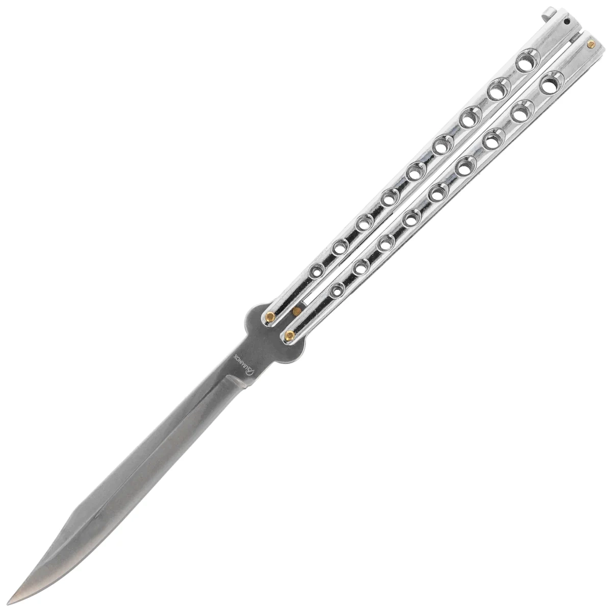 Rękojeść - wykonana z chromowanego zamaku, co zapewnia wysoką wytrzymałość i odpowiednią masę dla stabilnego chwytu. Gładka, błyszcząca powierzchnia nadaje elegancji. Klasyczna konstrukcja dwuramienna typu balisong, oparta na osiowym zawiasie z zatrzaskiem, gwarantuje płynne składanie i rozkładanie noża. Perforacje w ramionach poprawiają balans i kontrolę podczas manipulacji, a symetryczna forma sprawia, że nóż jest wygodny zarówno dla prawo-, jak i leworęcznych użytkowników. Mimo braku klipsa, odpowiednie wyważenie i ergonomia czynią z niego efektowny i funkcjonalny nóż dekoracyjno-treningowy.