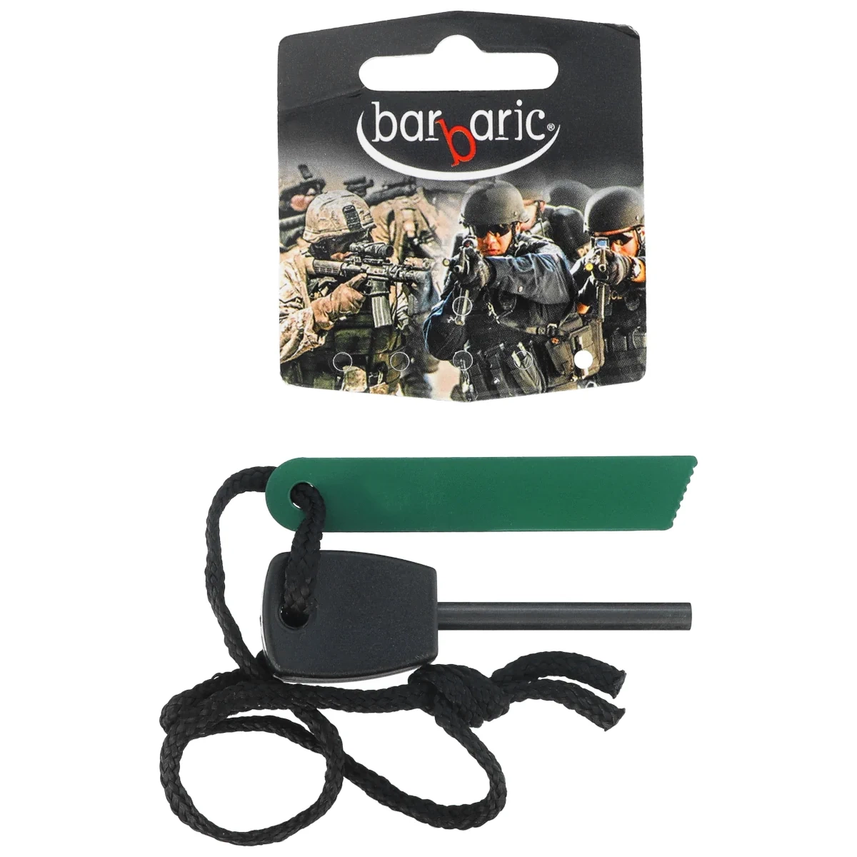 - Barbaric Fire Starter Green lekkie, kompaktowe krzesiwo magnezowe z dołączoną stalową iskrownicą. Działa niezawodnie w warunkach wilgoci, idealne do rozpalania ognia podczas wypraw survivalowych i outdoorowych.