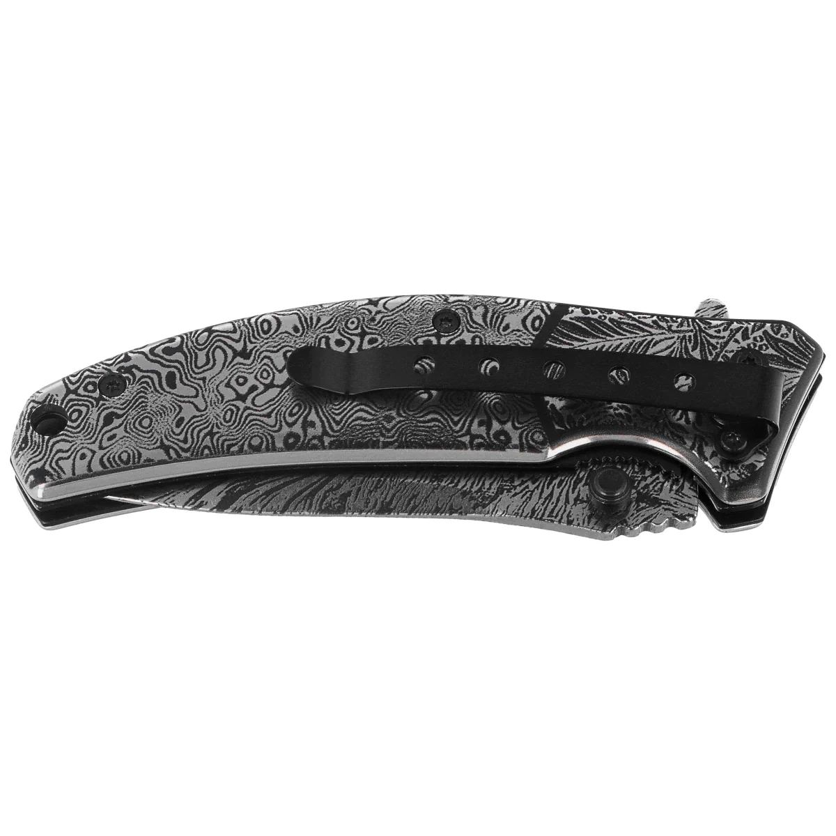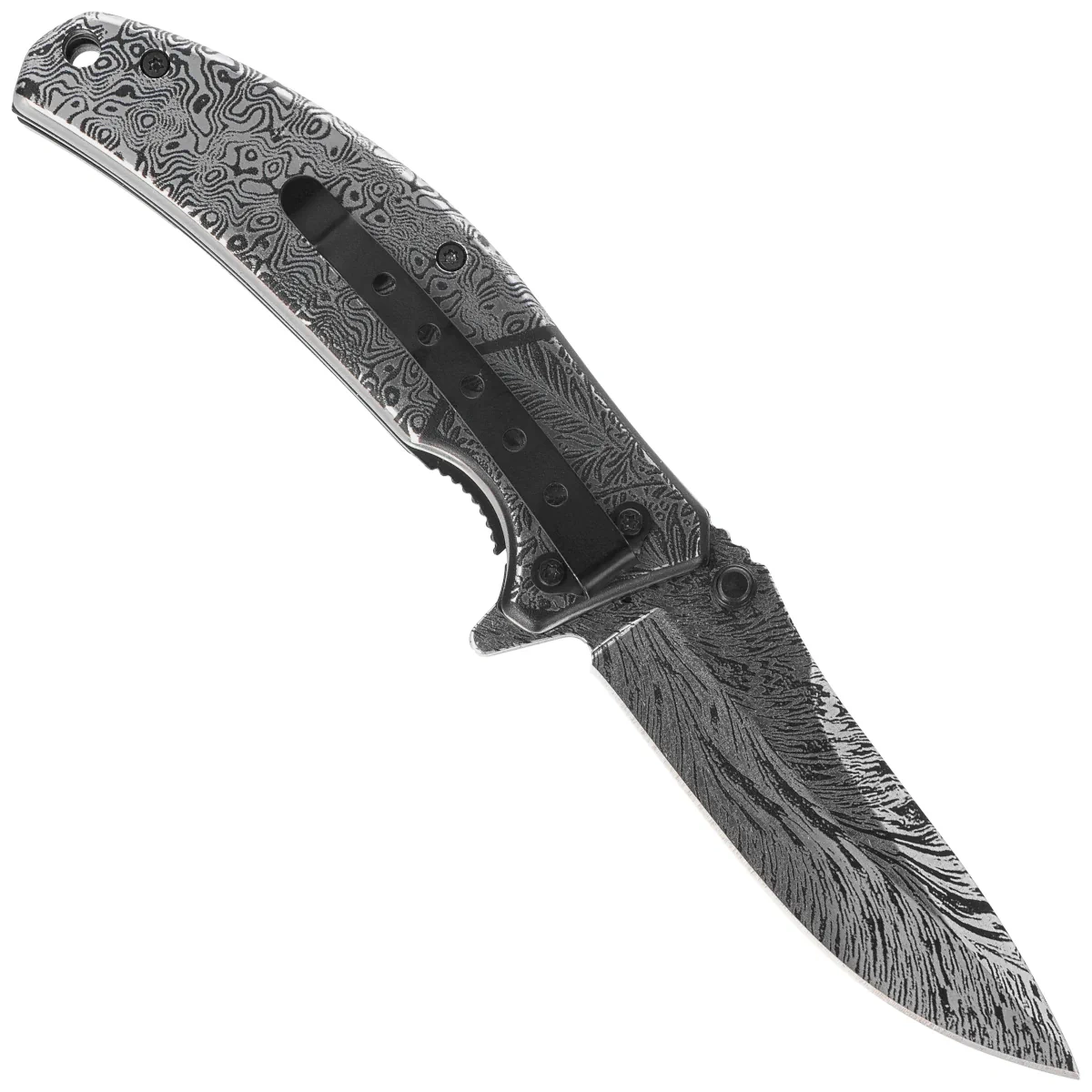 Rękojeść - wykonana z stalowych okładzin, ozdobionych identycznym jak na ostrzu wzorem 3D. Taka konstrukcja zapewnia wysoką odporność na uszkodzenia mechaniczne i wilgoć, a jej symetryczny, minimalistyczny wygląd doskonale komponuje się z głownią. Mimo gładkiej powierzchni, odpowiednie wyważenie i długość rękojeści zapewniają dobrą kontrolę chwytu. Klips do przenoszenia, zamontowany po jednej stronie, pozwala na łatwe i dyskretne noszenie noża w kieszeni. Rękojeść tego modelu to propozycja dla osób ceniących monolityczne, solidne konstrukcje z wyrazistym detalem – trwałe, praktyczne i estetyczne w codziennym użytkowaniu.