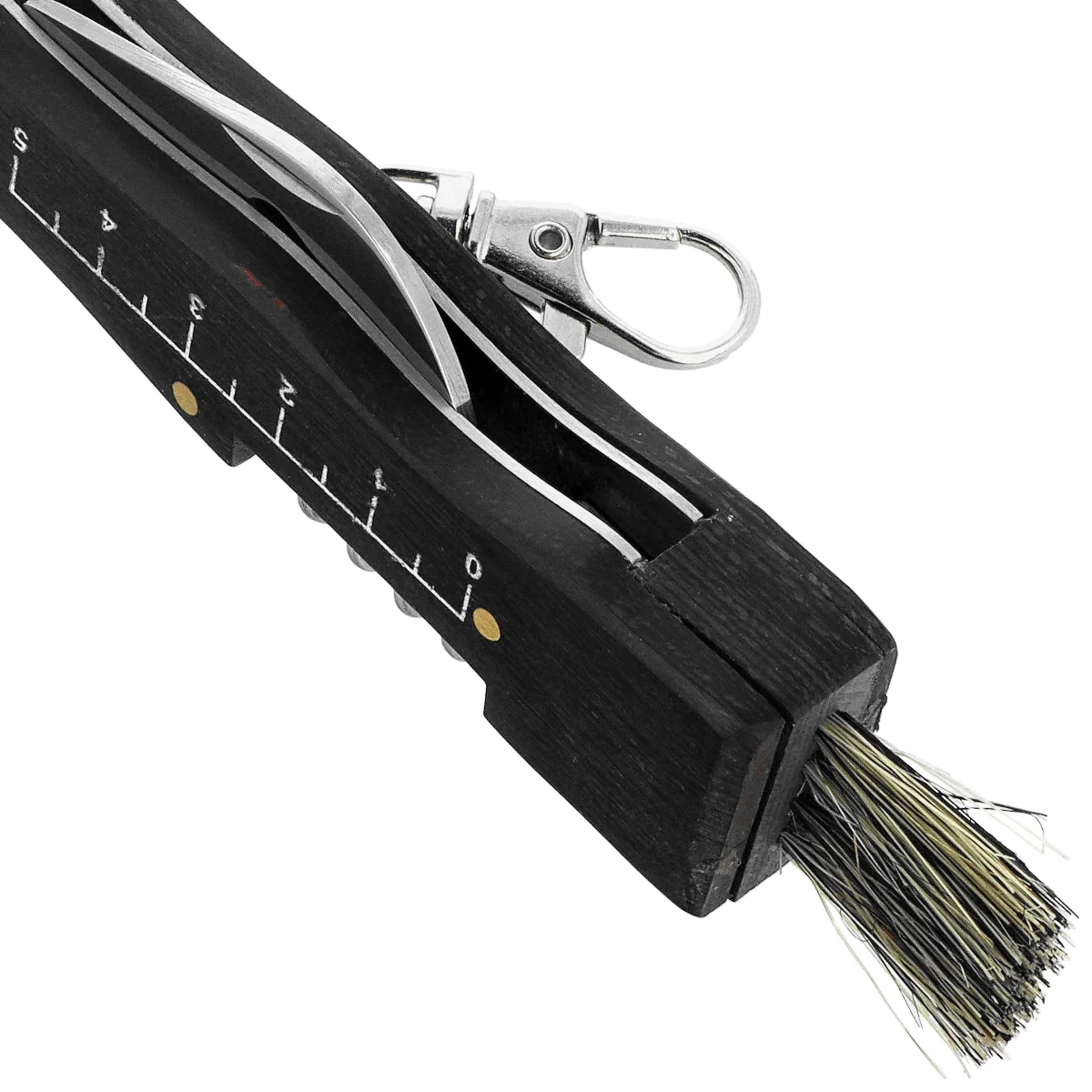 Rękojeść - z drewna naturalnego wyróżnia się nadrukiem linijki, która pomaga w ocenie wielkości zbieranych grzybów. W tylnej części umieszczono szczoteczkę z naturalnego włosia, pozwalającą na wstępne oczyszczanie grzybów bez potrzeby noszenia osobnych akcesoriów. Wbudowana metalowa pęseta umożliwia dokładne usuwanie igliwia i mchów. Na grzbiecie wygodny korkociag. Kółko na klucze z krótkim łańcuszkiem ułatwia mocowanie do plecaka lub spodni, a dołączony pokrowiec wspiera wygodne przenoszenie w terenie. Ergonomiczny kształt oraz dobrze wyważony balans rękojeści gwarantują komfort użytkowania nawet przez dłuższy czas. To konstrukcja zaprojektowana z myślą o sprawnym grzybobraniu – lekka, poręczna i odporna na warunki terenowe.