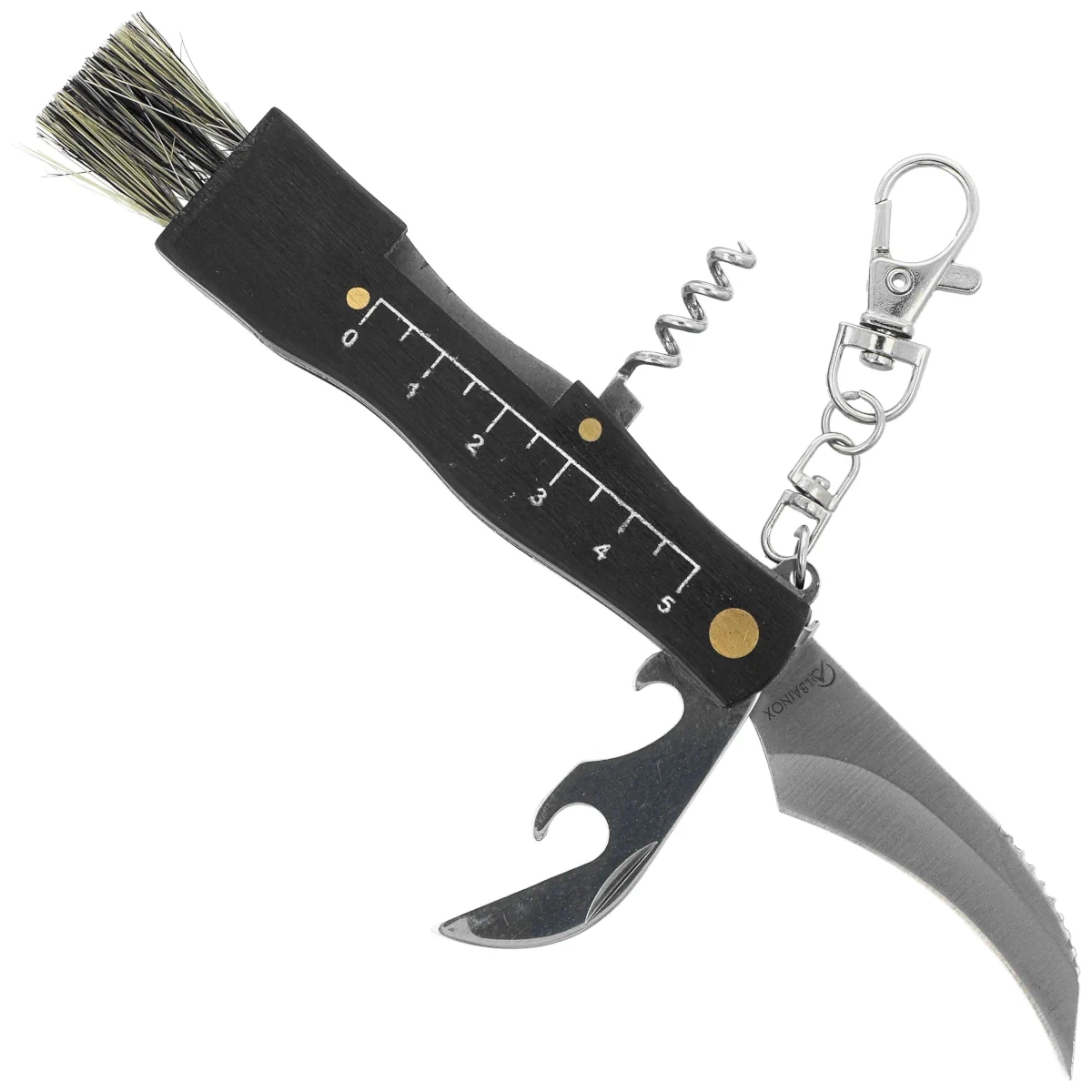 • Setera Multi Madera Wood, Satin wielofunkcyjny nóż grzybiarski od Martinez Albainox z zakrzywioną głownią ze stali 3Cr13MoV, rękojeścią z drewna, szczoteczką, pęsetą, otwieraczem do puszek i butelek, korkociągiem, kółkiem na klucze. Praktyczny i przydatny