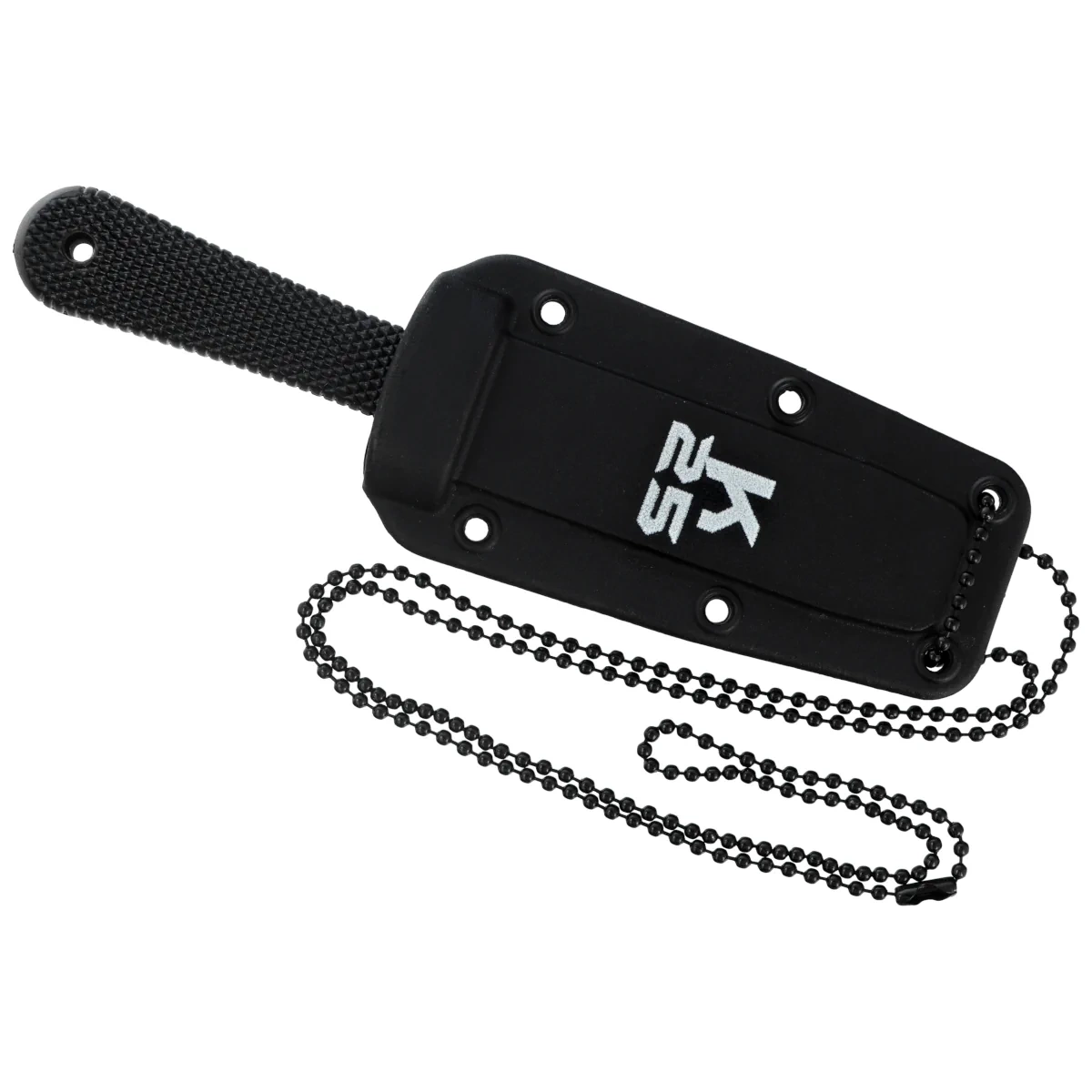 Rękojeść - z wytrzymałego tworzywa ABS, którego właściwości mechaniczne zapewniają odporność na zużycie i uszkodzenia w warunkach terenowych. Kompaktowy kształt został zoptymalizowany pod kątem pewnego chwytu, a zaokrąglone krawędzie poprawiają komfort użytkowania. W komplecie znajduje się formowana pochwa ABS z łańcuszkiem kulkowym, która umożliwia wygodne zawieszenie na szyi, zapewniając szybki dostęp do narzędzia. Całość tworzy lekką, funkcjonalną konstrukcję o taktycznym przeznaczeniu – gotową do działania zawsze wtedy, gdy liczy się niezawodność i mobilność.