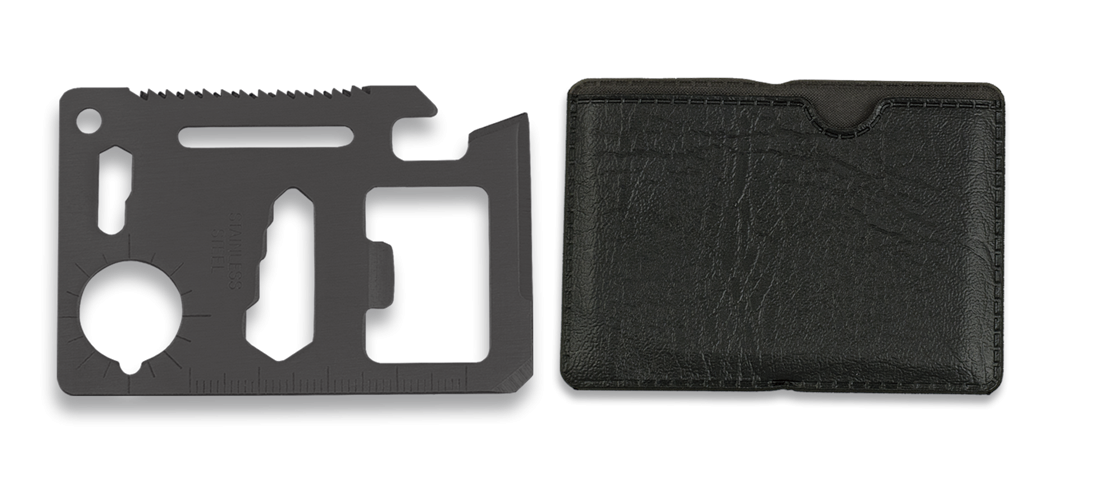 - Multi Purpose Card (33921) – uniwersalna karta survivalowa Barbaric w formacie karty kredytowej, wykonana ze stali nierdzewnej, z funkcjami EDC: śrubokręt, otwieracz, linijka, piła.