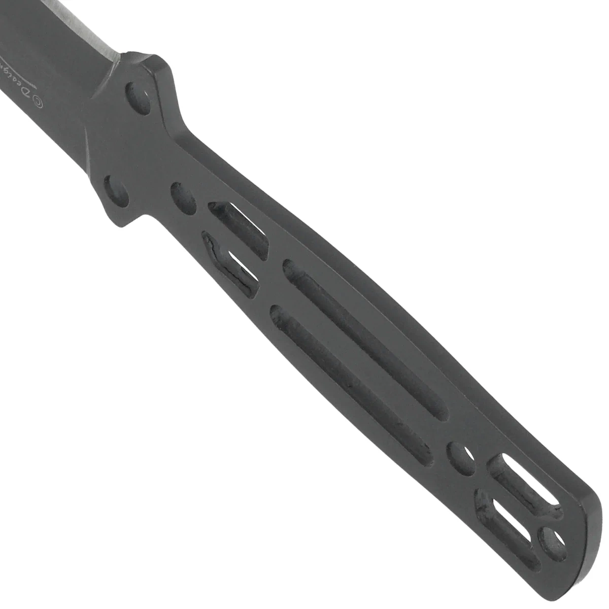 Rękojeść - zintegrowana z ostrzem rękojeść typu skeleton oferuje niską masę i możliwość pełnej personalizacji – użytkownik może nawinąć taśmę, skórę lub paracord, dostosowując chwyt do indywidualnych preferencji. Otwory technologiczne redukują wagę i poprawiają wentylację dłoni, a symetryczna geometria pozwala na wygodne operowanie nożem niezależnie od chwytu. Brak okładzin upraszcza konserwację i wzmacnia surowy, taktyczny wygląd całości. W zestawie znajduje się lekka pochwa z kydexu wyposażona w łańcuszek, który umożliwia noszenie noża na szyi – zawsze pod ręką, zawsze gotowy do działania. Idealny wybór dla tych, którzy cenią dyskrecję, mobilność i skuteczność.