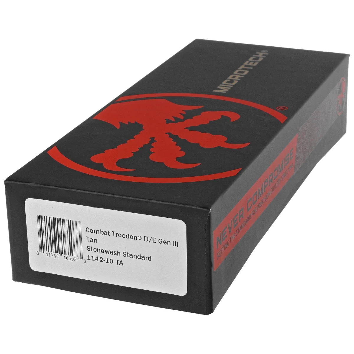 Combat Troodon Gen III D/E Tan Aluminium, Stonewashed ten największy z noży automatycznych, to szczyt precyzyjnej inżynierii i taktycznej sprawności w dziedzinie noży OTF (Out The Front). Zbudowany z myślą o szerokim spektrum zastosowań użytkowych, może pochwalić się większym o 25% rozmiarem w porównaniu do flagowego Troodona. Precyzyjnie wykonany, wyposażony w wyrafinowany i piekielnie szybki mechanizm wysuwający ostre jak brzytwa ostrze. W 100% wyprodukowany i zmontowany w USA. Projekt Anthony'ego Marfione, knifemakera i właściciela Microtech Knives.