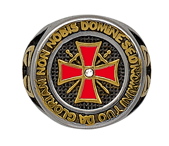 - Templar Seal Ring Ø21 – sygnet z czerwonym krzyżem równoramiennym na tle skrzyżowanych mieczy, otoczony dewizą templariuszy: „Non nobis Domine, sed nomini tuo da gloriam”. Kontrastowe wykończenie w odcieniach srebra, czerni i złota. Średnica: Ø21 mm.