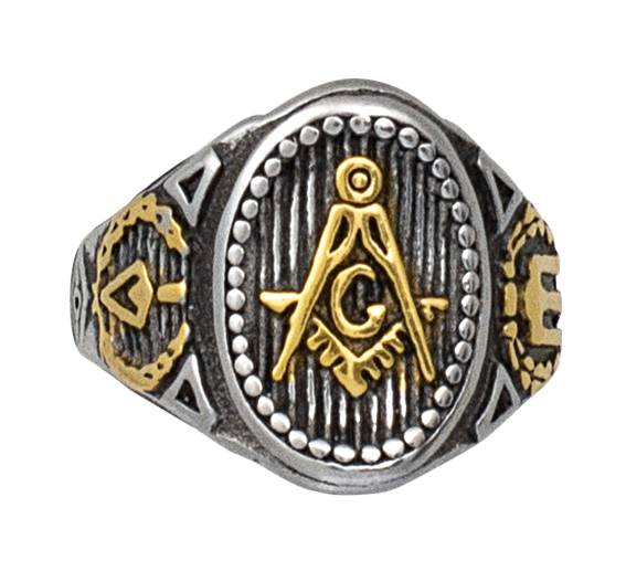 - Masons Ring Ø20 (16200-20) – symboliczny sygnet z emblematem wolnomularskim (cyrkiel, kątownik, litera „G”) w złotym wykończeniu na tle żłobionego metalu. Dodatkowe insygnia boczne i antyczne srebrno-czarne wykończenie nadają mu rytualny charakter.