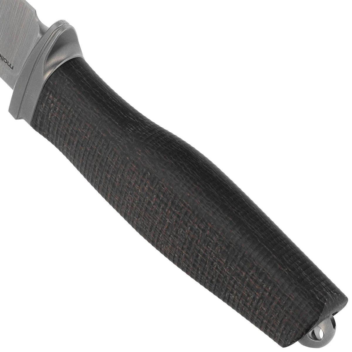 Rękojeść - wykonano z Burlap Micarty, czyli warstw włókien jutowych zatopionych w żywicy epoksydowej. Dzięki swojej strukturze materiał ten oferuje wyjątkową odporność na wilgoć, ścieranie i zmienne temperatury, pozostając jednocześnie lekki i komfortowy w użytkowaniu. Chropowata powierzchnia zapewnia dobrą przyczepność także w rękawicach lub przy mokrej dłoni. Profilowanie uchwytu zostało zaprojektowane z myślą o maksymalnej ergonomii – zaokrąglone krawędzie i delikatne podcięcia pod palce poprawiają komfort długotrwałej pracy. Całość zamknięta jest stalową nakrętką serwisową w tylnej części rękojeści, umożliwiającą łatwy demontaż rękojeści do czyszczenia. Konstrukcja hidden tang, w połączeniu z tytanowym jelcem, gwarantuje sztywność, odporność na przeciążenia i wysoką niezawodność nawet przy intensywnym użytkowaniu. Rękojeść Acha to doskonale wyważone połączenie nowoczesnych materiałów i klasycznej formy użytkowej.
