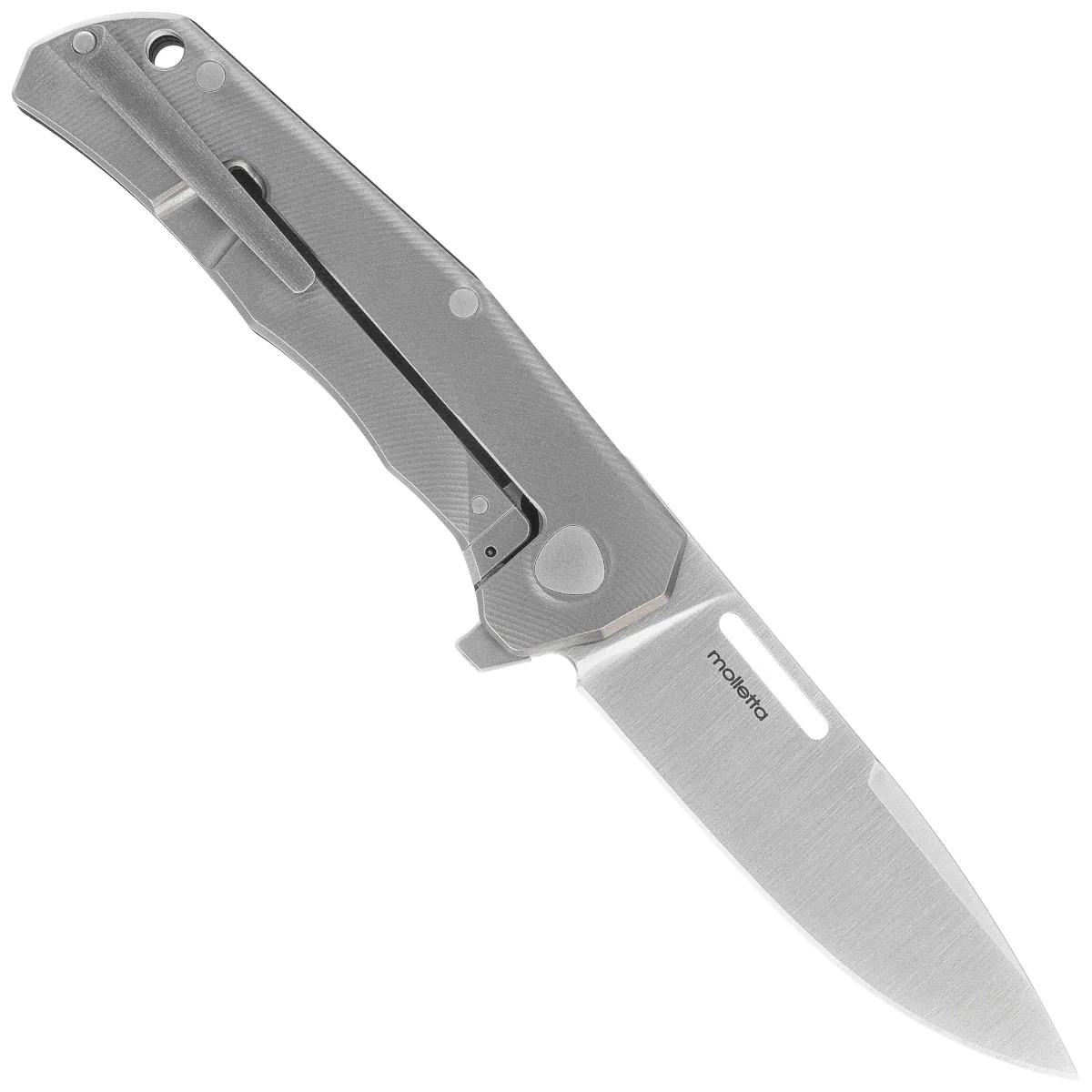 Rękojeść - strona prezentacyjna z kompozytu G10, strona blokady z frezowanego tytanu 6Al-4V, znanego z lekkości i wyjątkowej odporności mechanicznej. Wyprofilowany uchwyt z zaokrąglonymi krawędziami pozwala na wygodny i pewny chwyt, nawet przy długotrwałym użytkowaniu. Zintegrowany mechanizm frame lock zwiększa bezpieczeństwo pracy, a obustronnie montowany klips deep carry z tytanu umożliwia niskoprofilowe przenoszenie noża – niezależnie od dominującej ręki użytkownika. Ergonomia, estetyka i funkcjonalność łączą się w tym modelu w sposób kompleksowy, oferując doskonałe narzędzie EDC nowej generacji.