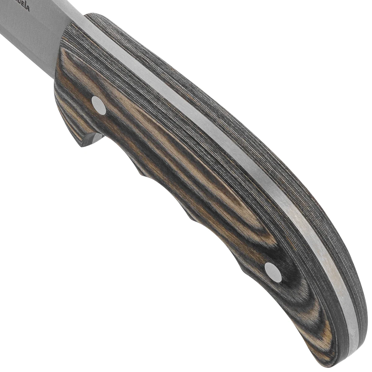 Muela Outdoor-12M to pełnowartościowy nóż outdoorowy, który łączy tradycyjne rzemiosło z nowoczesnym podejściem do materiałów i użytkowości. Zaprojektowany z myślą o praktycznych zadaniach terenowych, sprawdzi się zarówno w trakcie polowania, jak i codziennych aktywności bushcraftowych. Konstrukcja typu full tang gwarantuje stabilność i odporność na przeciążenia, czyniąc model Outdoor-12M godnym zaufania narzędziem w wymagających warunkach. Głownia wykonana ze stali nierdzewnej X50CrMoV15 oferuje optymalną równowagę między odpornością na korozję, wytrzymałością i łatwością ostrzenia. Subtelne satin finish dodaje jej elegancji, a funkcjonalna geometria pozwala na efektywne cięcie, skrobanie i przebijanie. Rękojeść z laminatu drewna Pakka wnosi element klasy i naturalnego ciepła, zapewniając jednocześnie komfortowy chwyt nawet przy dłuższej pracy. Model uzupełnia ręcznie szyta pochwa ze skóry wołowej, przystosowana do noszenia przy pasie. To narzędzie dla osób, które szukają noża o wyważonym charakterze – praktycznego, niezawodnego i estetycznego zarazem.