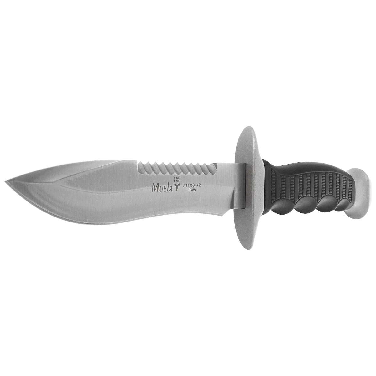 - Muela 85-162 pełnowymiarowy nóż ze stałym ostrzem o profilu Bowie. Wykonany ze stali nierdzewnej Nitro-42 pokrytej ochronnym czarnym wykończeniem z wytrzymałą rękojeścią wykonaną z gumy i zamaku. Zaprojektowany do zastosowań terenowych i taktycznych.