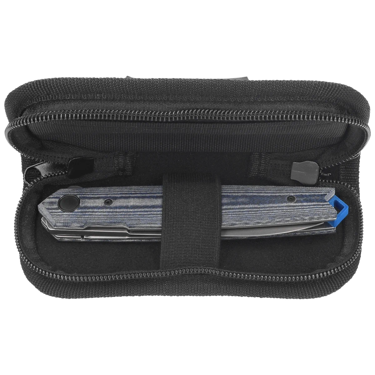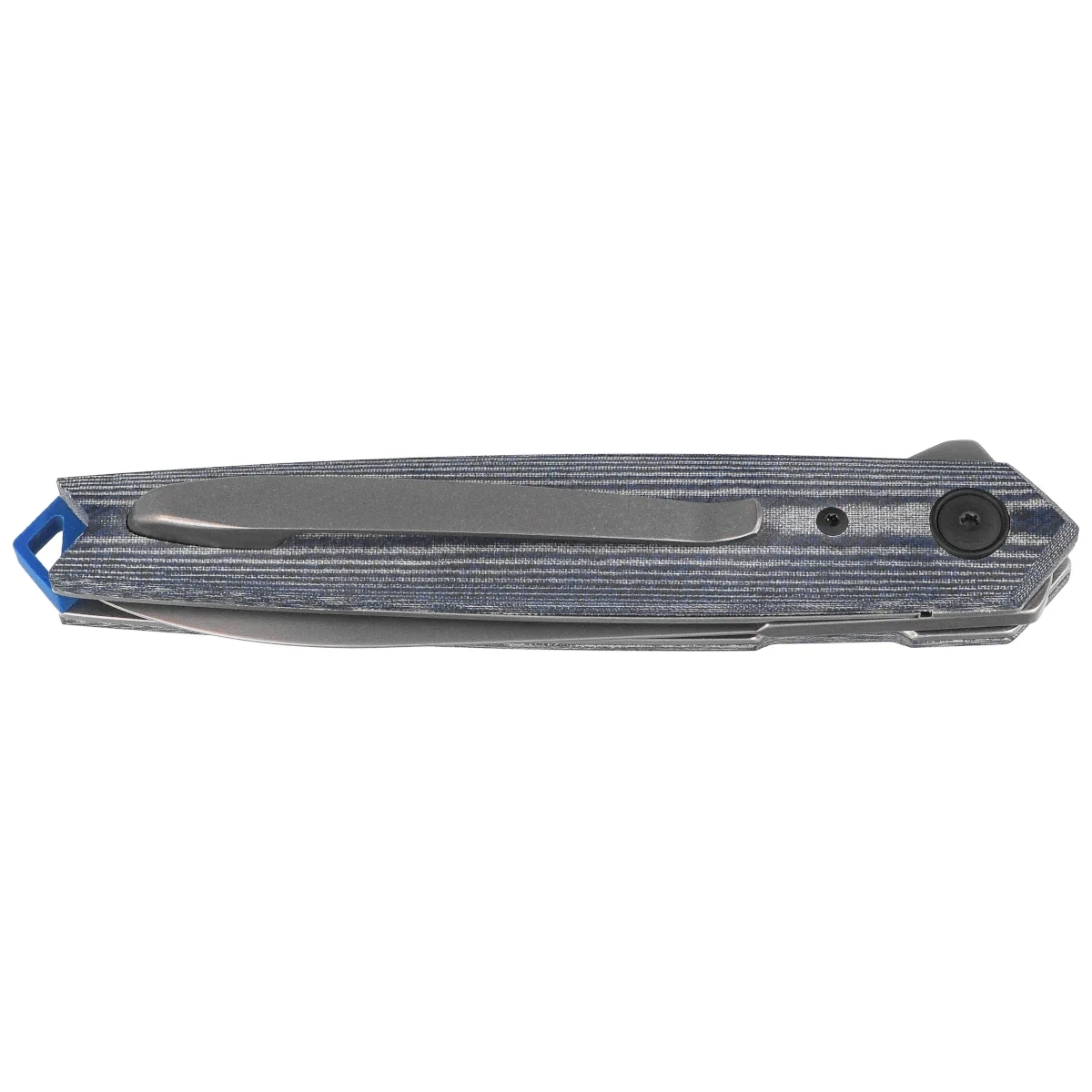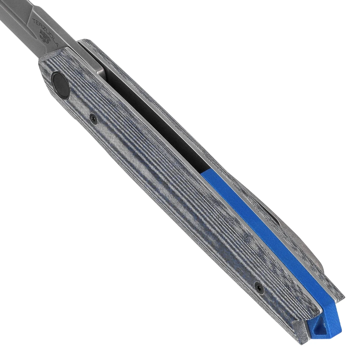 Rękojeść - z kompozytu Denim Micarta, zapewnia trwałość i wygodny chwyt nawet przy wilgotnych dłoniach. Subtelne profilowanie poprawia ergonomię, a stalowe linery stabilizują całość konstrukcji. Całość uzupełnia klips typu tip-up, umożliwiający dyskretne przenoszenie noża w kieszeni. Backspacer z niebieskiego G10 nie tylko wzmacnia konstrukcję, ale dodaje także akcent wizualny. Tylne oczko umożliwia montaż linki lub bead’a. Projekt łączy klasyczne linie z nowoczesnymi materiałami, tworząc konstrukcję solidną, estetyczną i przygotowaną na intensywne użytkowanie.