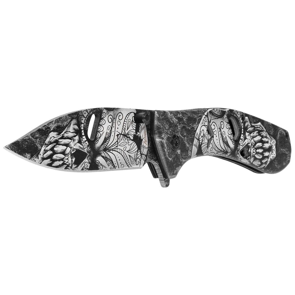 Rękojeść - z lekkiego aluminium, którego powierzchnię pokrywa trójwymiarowy nadruk 3D Printed w stylistyce neogotyckiej, przedstawiający czaszki i ornamenty w wysokim kontraście czerni i bieli. Taki zabieg nadaje nożowi indywidualny charakter i wizualną głębię. Frezowania oraz ażurowe otwory poprawiają chwytność i zmniejszają wagę całej konstrukcji. Zintegrowany deep carry clip umożliwia dyskretne przenoszenie foldera w kieszeni. Estetyka rękojeści nawiązuje do stylistyki tactical z domieszką undergroundowej ekspresji – dla osób, które szukają narzędzia z wyraźnym charakterem.