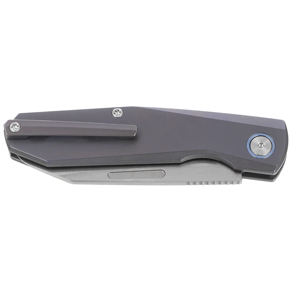 Rękojeść - wyfrezowana z tytanu 6AL4V, kolorowana termicznie na niebiesko. Konstrukcja o profilu open back pozwala na łatwą konserwację oraz zmniejszenie masy całkowitej. Ergonomiczne wyprofilowanie pod palec wskazujący oraz smukła geometria zapewniają komfort i precyzję chwytu. Symetryczny, obustronny klips deep carry umożliwia niskoprofilowe przenoszenie noża w kieszeni bez ingerencji w stylistykę konstrukcji. Akcenty takie jak anodyzowany pierścień pivotu podkreślają nowoczesny, surowy charakter projektu, w którym funkcjonalność idzie w parze z minimalistycznym wzornictwem.