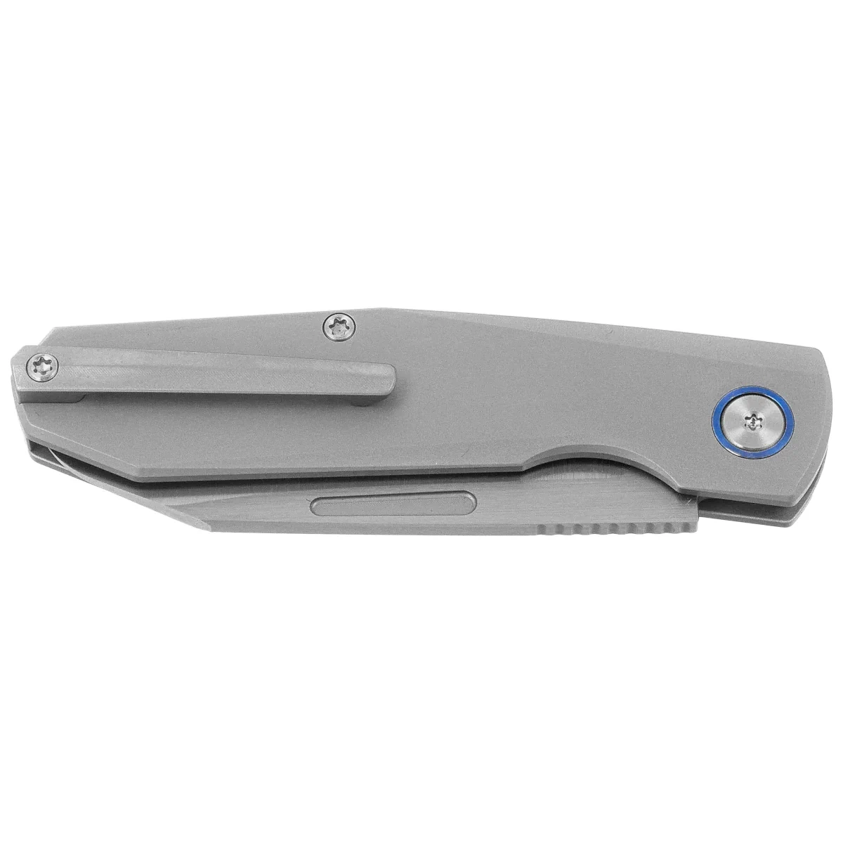 Rękojeść - wyfrezowana z tytanu 6AL4V, została poddana piaskowaniu, co nadaje jej matową, odporną na ślady użytkowania powierzchnię. Konstrukcja o profilu open back pozwala na łatwą konserwację oraz zmniejszenie masy całkowitej. Ergonomiczne wyprofilowanie pod palec wskazujący oraz smukła geometria zapewniają komfort i precyzję chwytu. Symetryczny, obustronny klips deep carry umożliwia niskoprofilowe przenoszenie noża w kieszeni bez ingerencji w stylistykę konstrukcji. Akcenty takie jak anodyzowany pierścień pivotu podkreślają nowoczesny, surowy charakter projektu, w którym funkcjonalność idzie w parze z minimalistycznym wzornictwem.