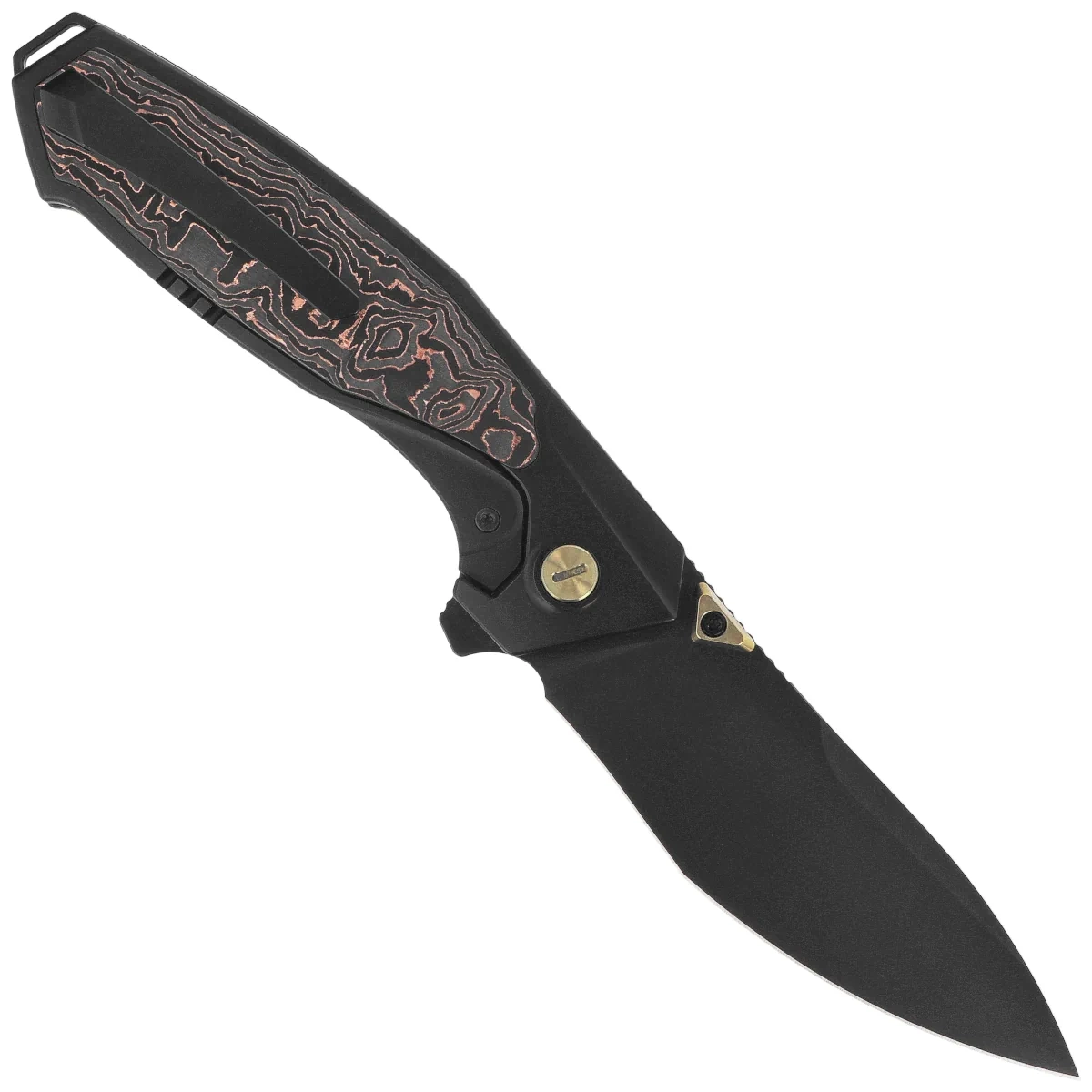 Rękojeść - z frezowanego tytanu 6AL4V, stanowi solidną podstawę dla smukłej i trwałej konstrukcji. Wstawki z kompozytu Copper Carbon Fiber poprawiają chwyt oraz podkreślają nowoczesny charakter projektu. Rękojeść została wyprofilowana tak, aby zapewnić komfort i kontrolę nawet przy dłuższej pracy – ergonomiczne przetłoczenia naturalnie dopasowują się do dłoni. Całość uzupełniają zintegrowany backspacer który po demontażu może służyć do odkręcenia śruby pivota, oraz klips typu deep carry, który umożliwia niskoprofilowe i bezpieczne noszenie. Projekt rękojeści stanowi przemyślaną równowagę między estetyką a praktycznością, odpowiadając na potrzeby doświadczonych użytkowników EDC.