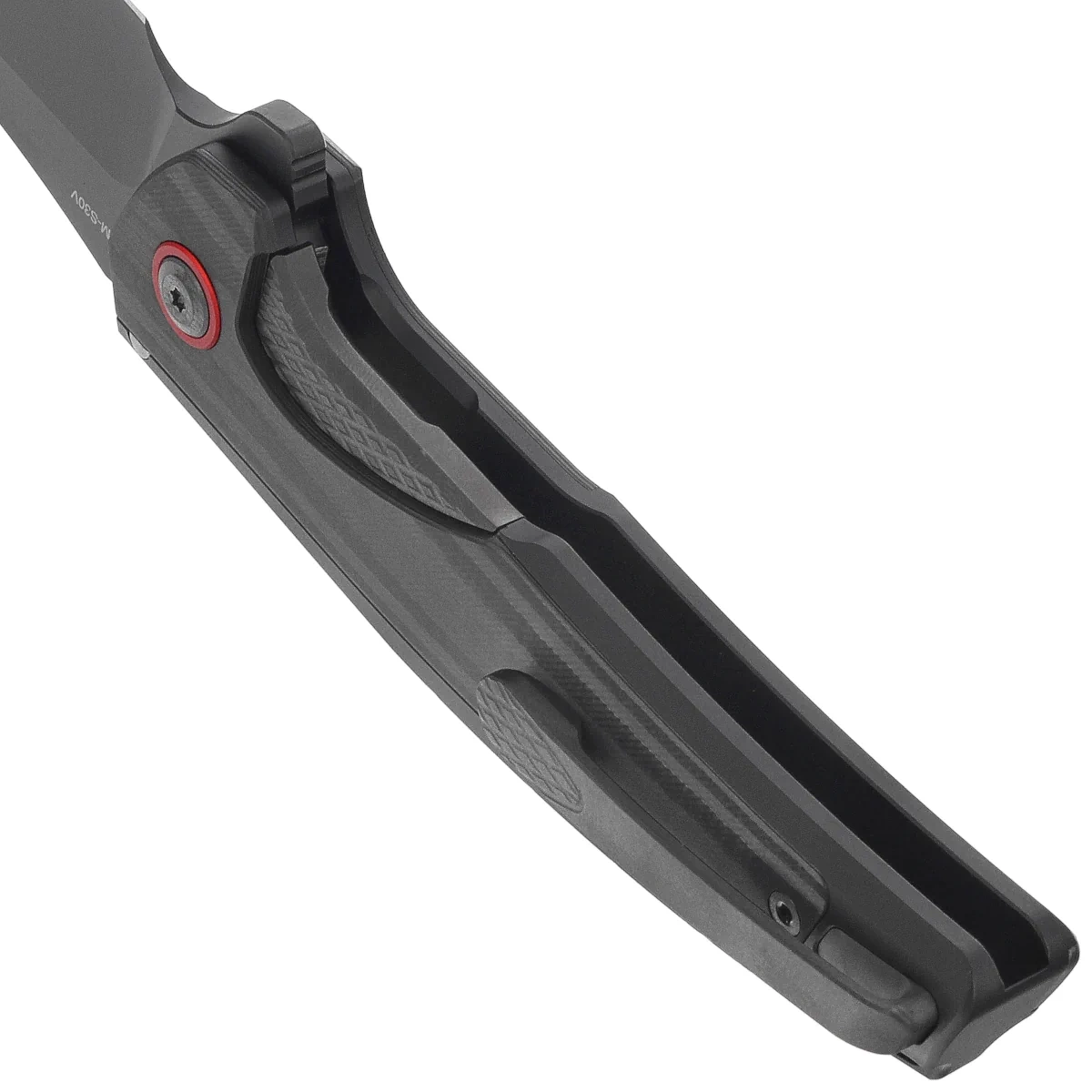 Rękojeść - monolityczna rękojeść z jednego kawałka anodowanego aluminium wyróżnia się wysoką sztywnością i niską wagą, dzięki precyzyjnej obróbce CNC. Inlay z carbon fiber wprowadza lekkość i techniczną estetykę, kontrastując z matową strukturą aluminium. Profilowane linie chwytu oraz ergonomiczne wycięcia poprawiają komfort użytkowania, a blokada frame lock gwarantuje pewne zamknięcie ostrza w pozycji roboczej. Pivot ozdobiono czerwonym pierścieniem. Całość charakteryzuje się doskonałym balansem i sprawdzi się zarówno w codziennym noszeniu, jak i jako element zaawansowanej kolekcji EDC.